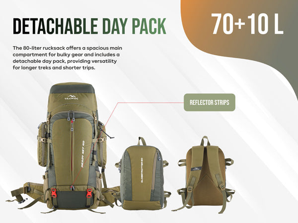 Spacious & Flexible: 70L main compartment plus a detachable 10L daypack for short trips, providing a total of 80L storage.