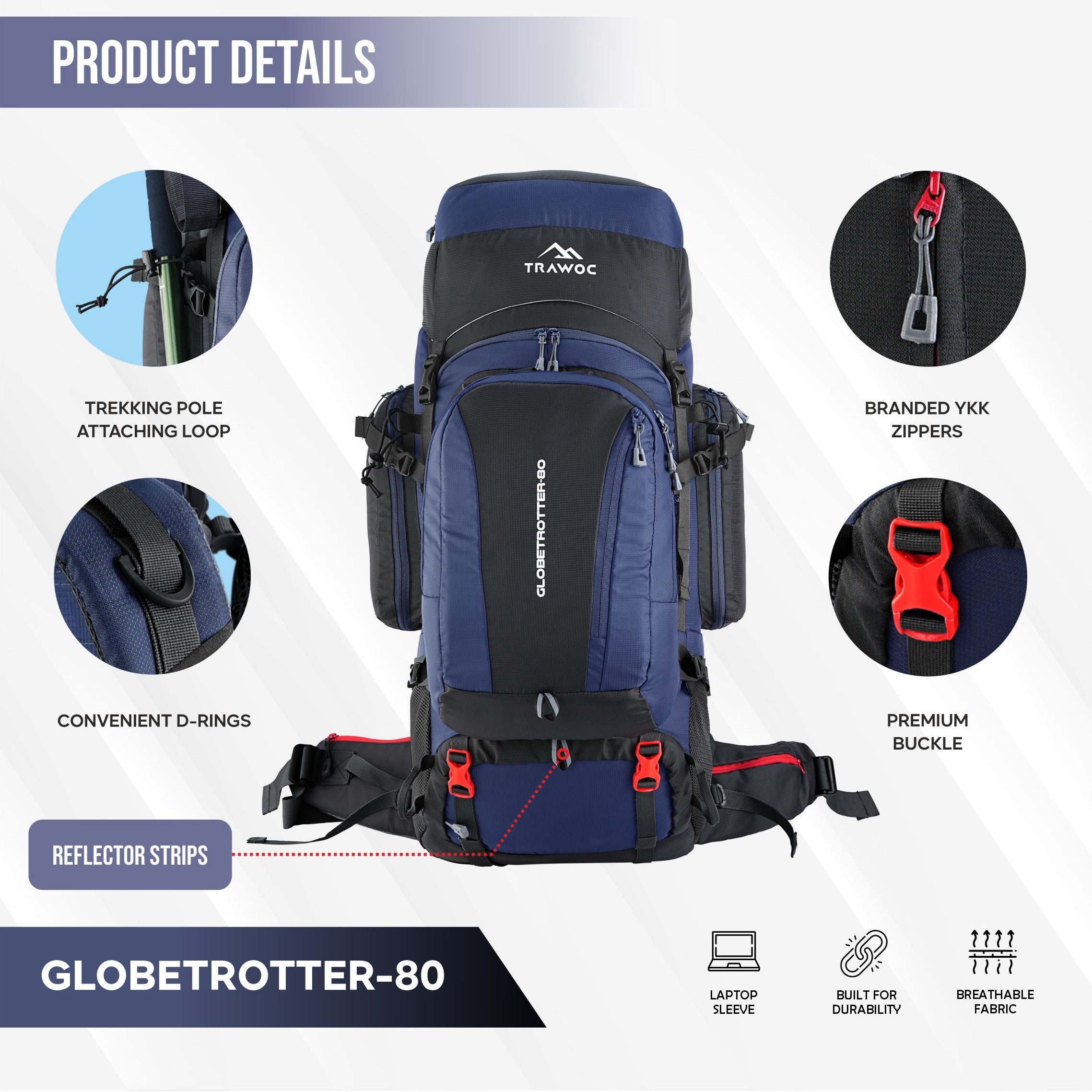 Globetrotter 80 L Trekking Bag with Rain Cover, Shoe section & internal metal frame - Navyblue - TRAWOC