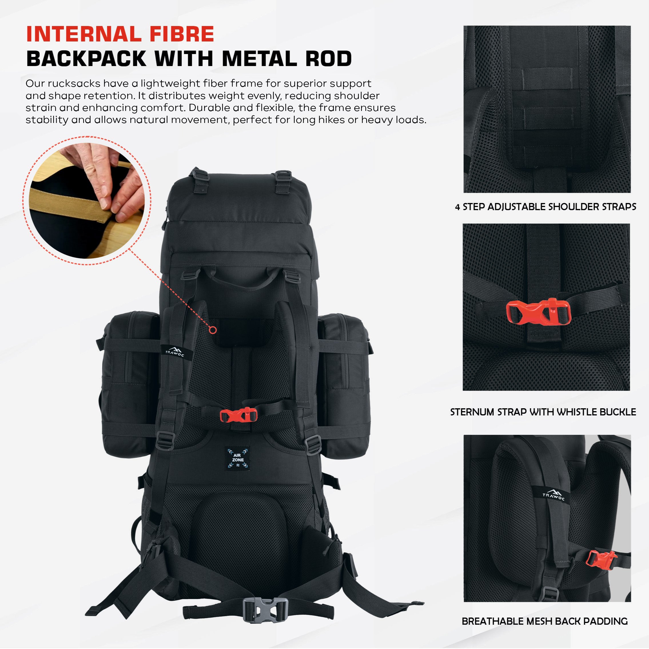 Breathable back padding ensures superior airflow, keeping you cool and sweat-free during long treks.
