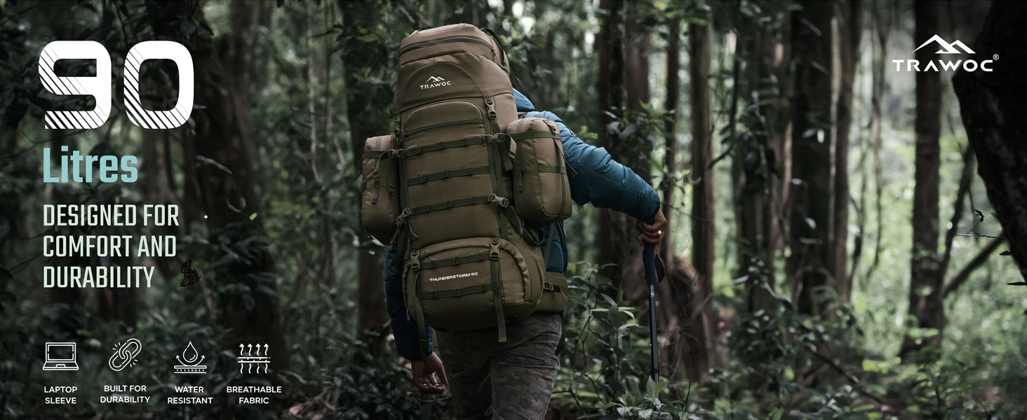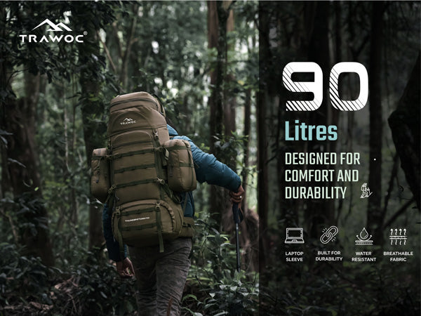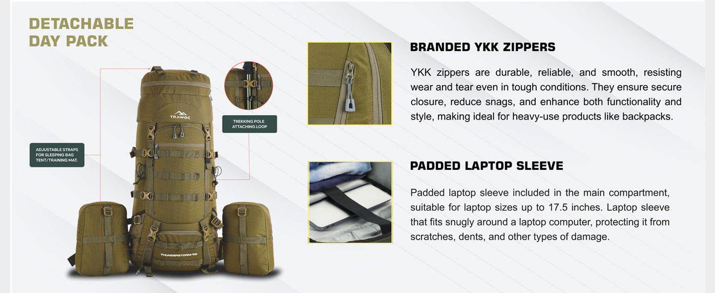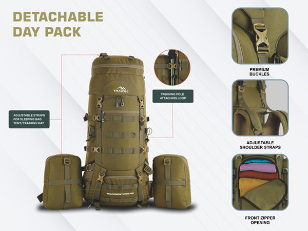 Large Capacity: 90L backpack with 80L main compartment and two detachable 5L side pockets.