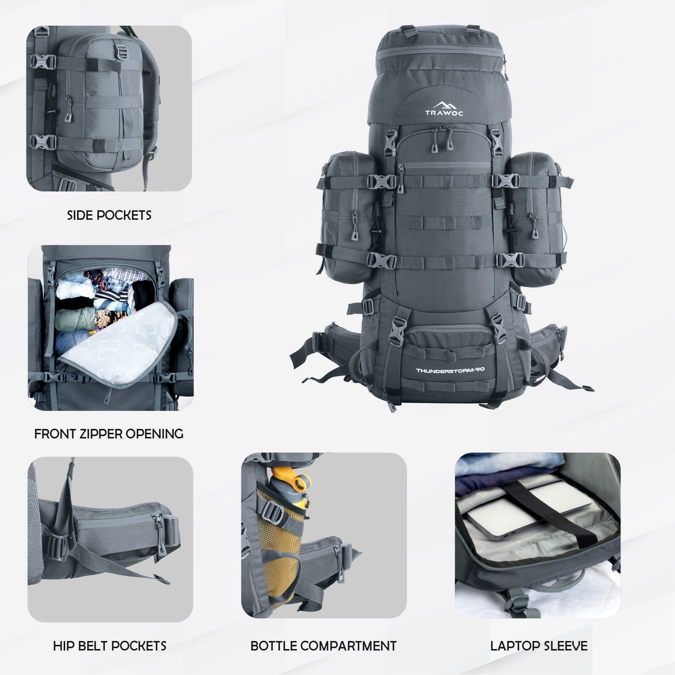 Large Capacity: 90L backpack with 80L main compartment and two detachable 5L side pockets.