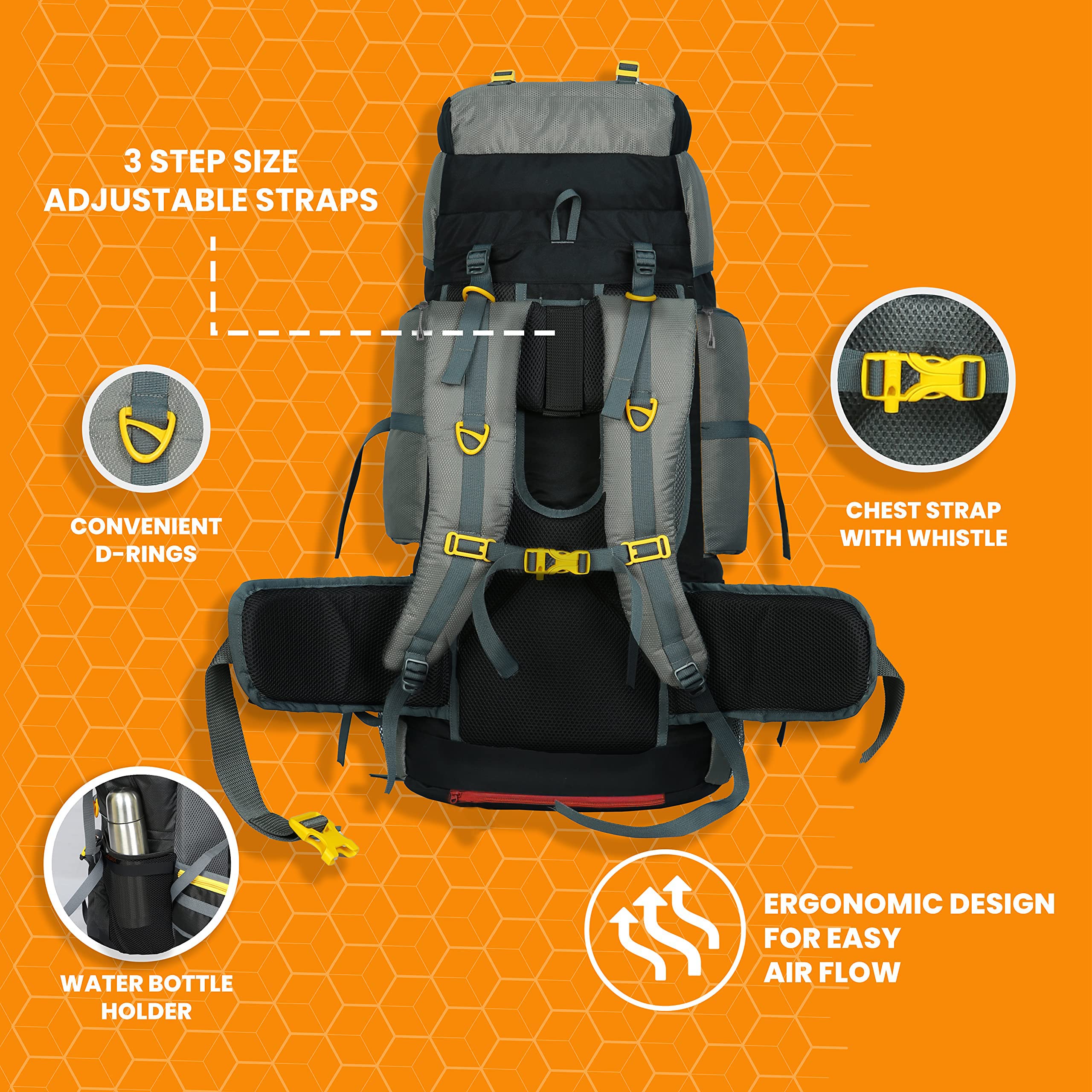 Ergonomic Support System: Internal fiber frame, padded back panel with air ventilation, adjustable torso system, and padded hip belt for comfort and stability on long trips.