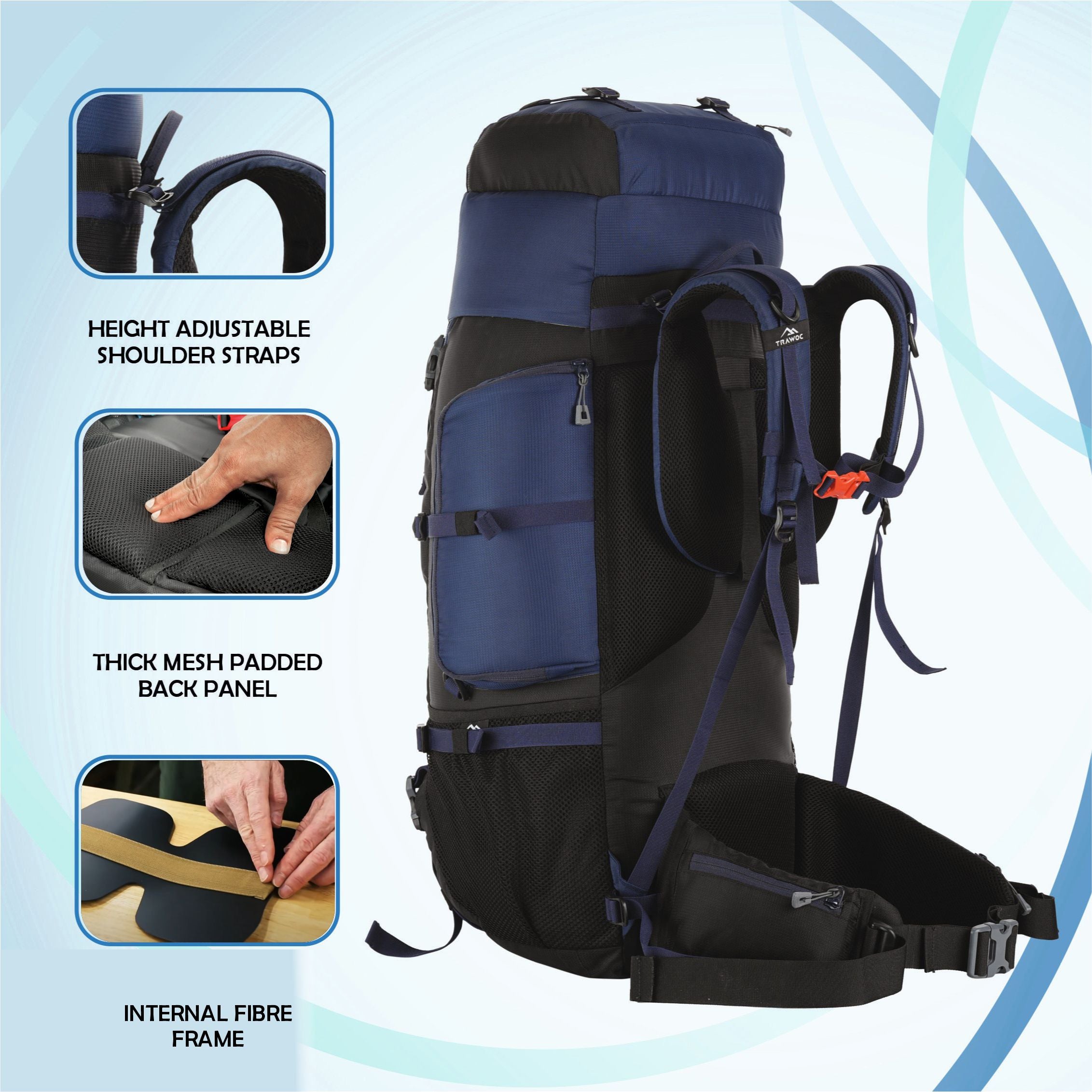 Ergonomic Support System: Internal fiber frame, padded back panel with air ventilation, adjustable torso system, and padded hip belt for comfort and stability on long trips.