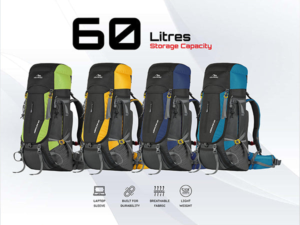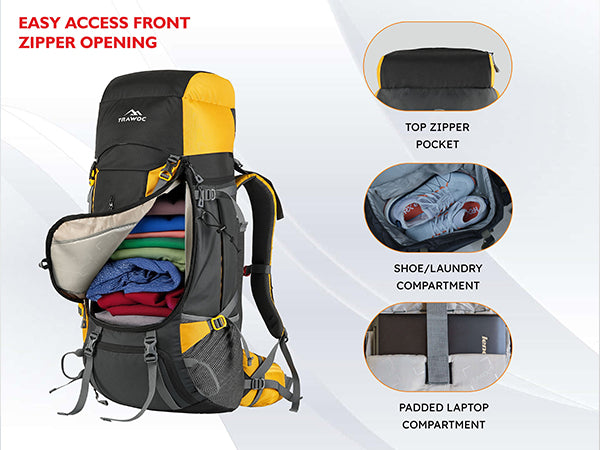 Spacious 60L Capacity: Ideal for trekking and travel, this backpack features front and top loading, a padded laptop sleeve, and a separate shoe compartment for organized packing.