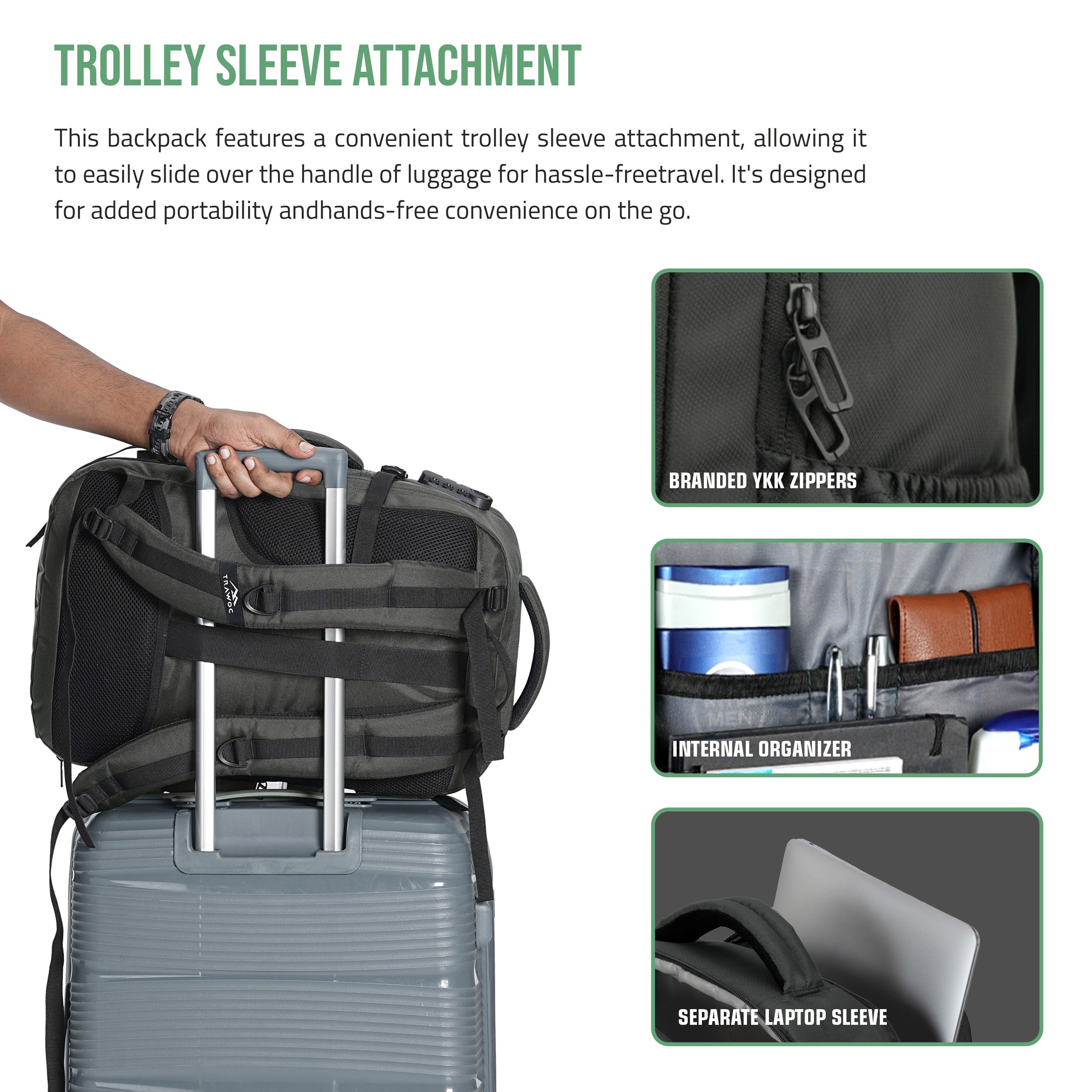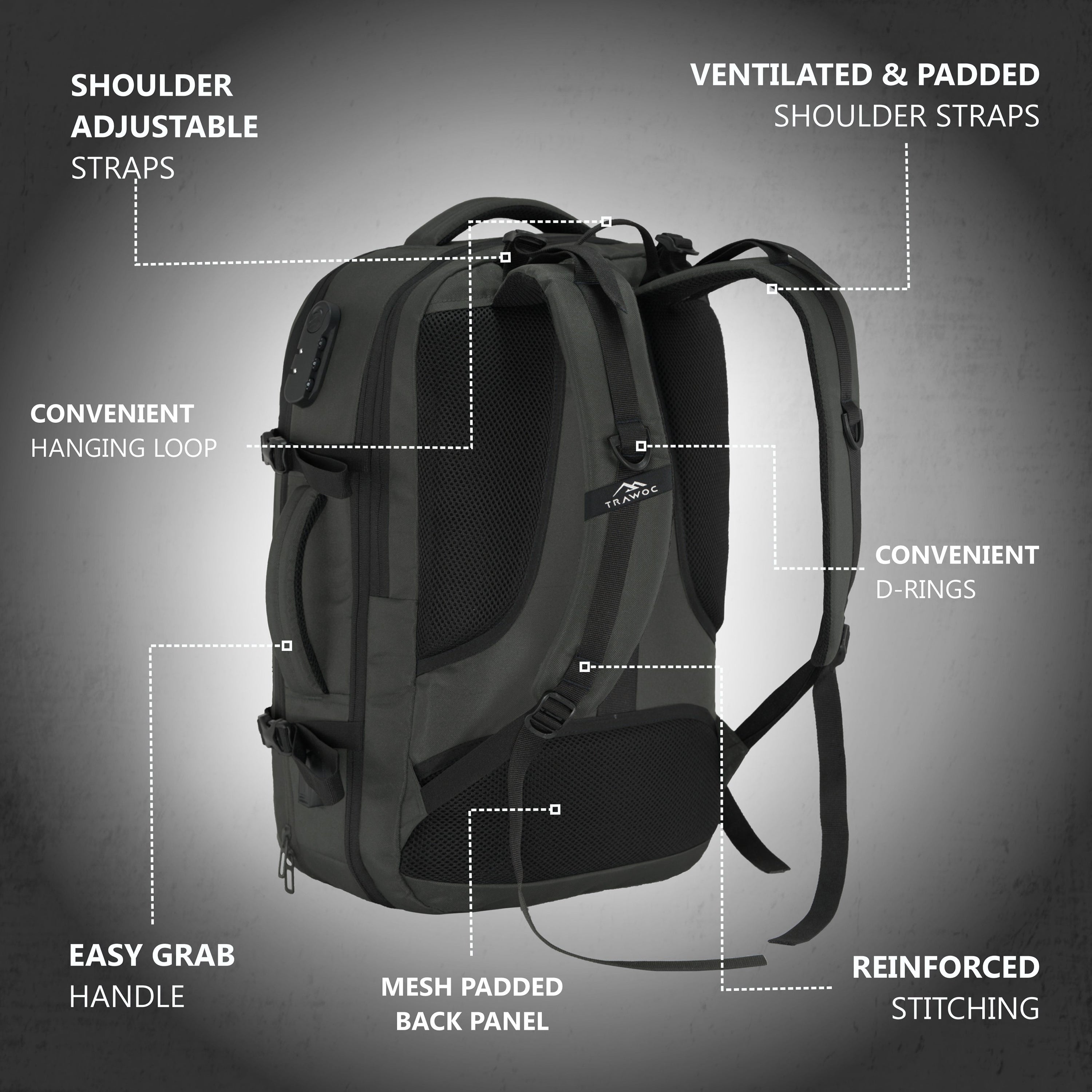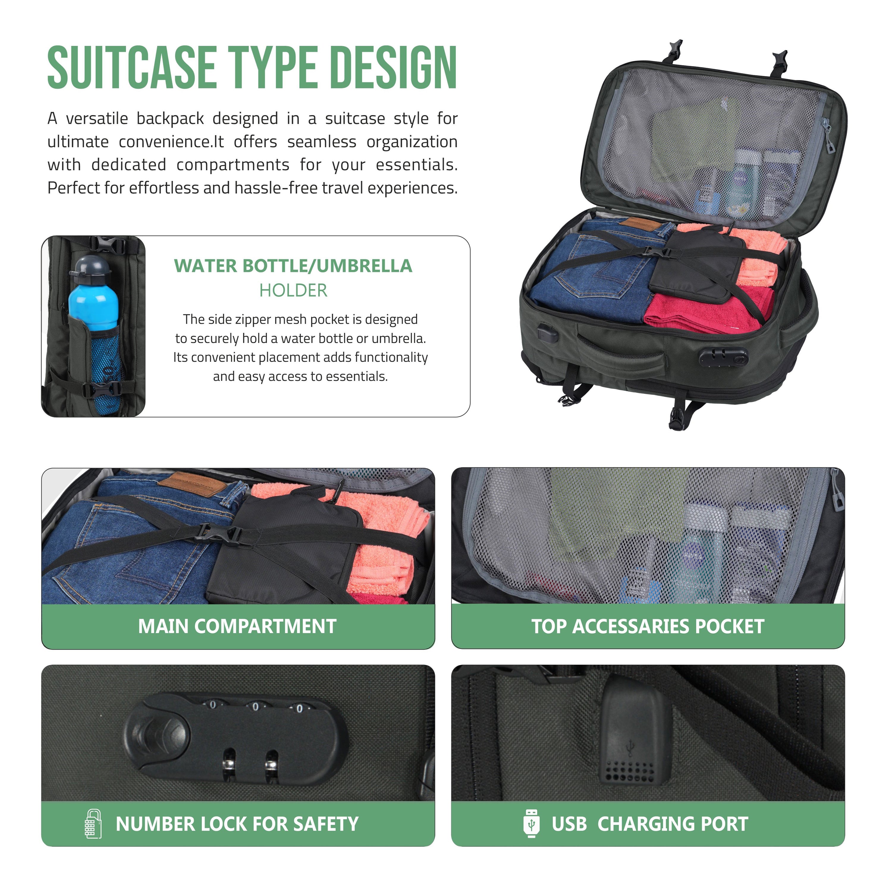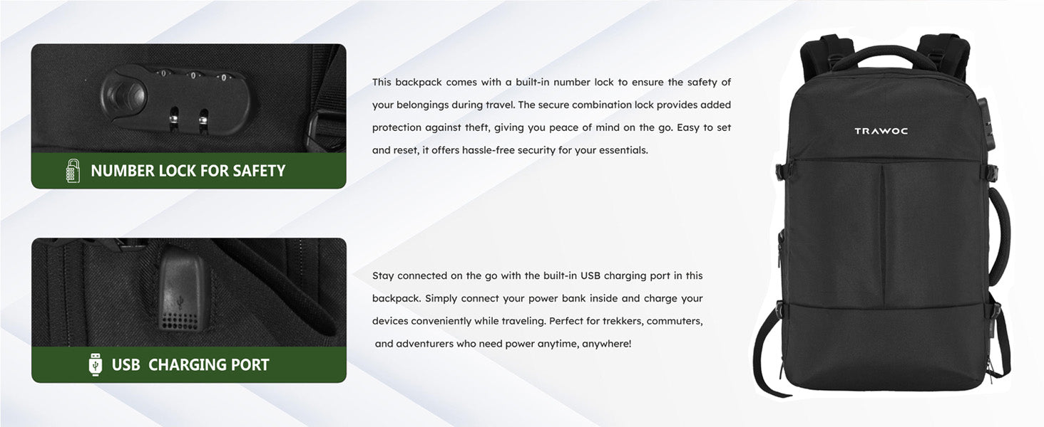 Smart & Secure Design: Front-open backpack with suitcase-style access and an integrated number lock for easy packing and added travel security.