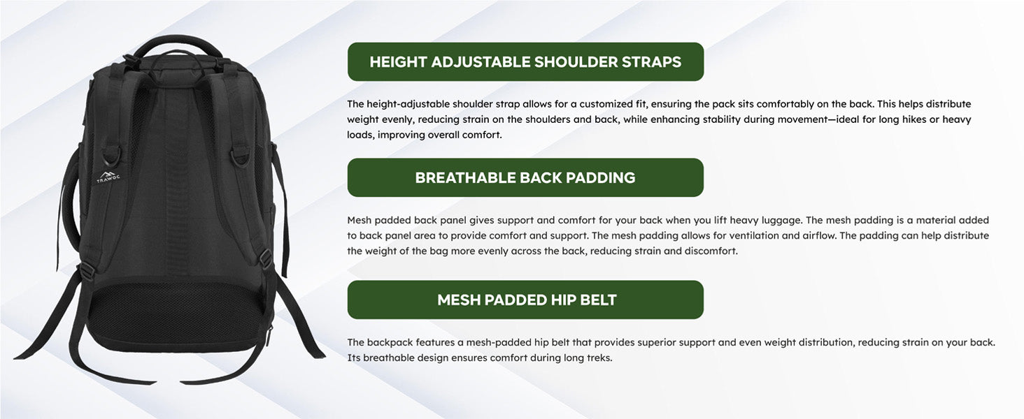 Breathable back padding ensures superior airflow, keeping you cool and sweat-free during long treks.