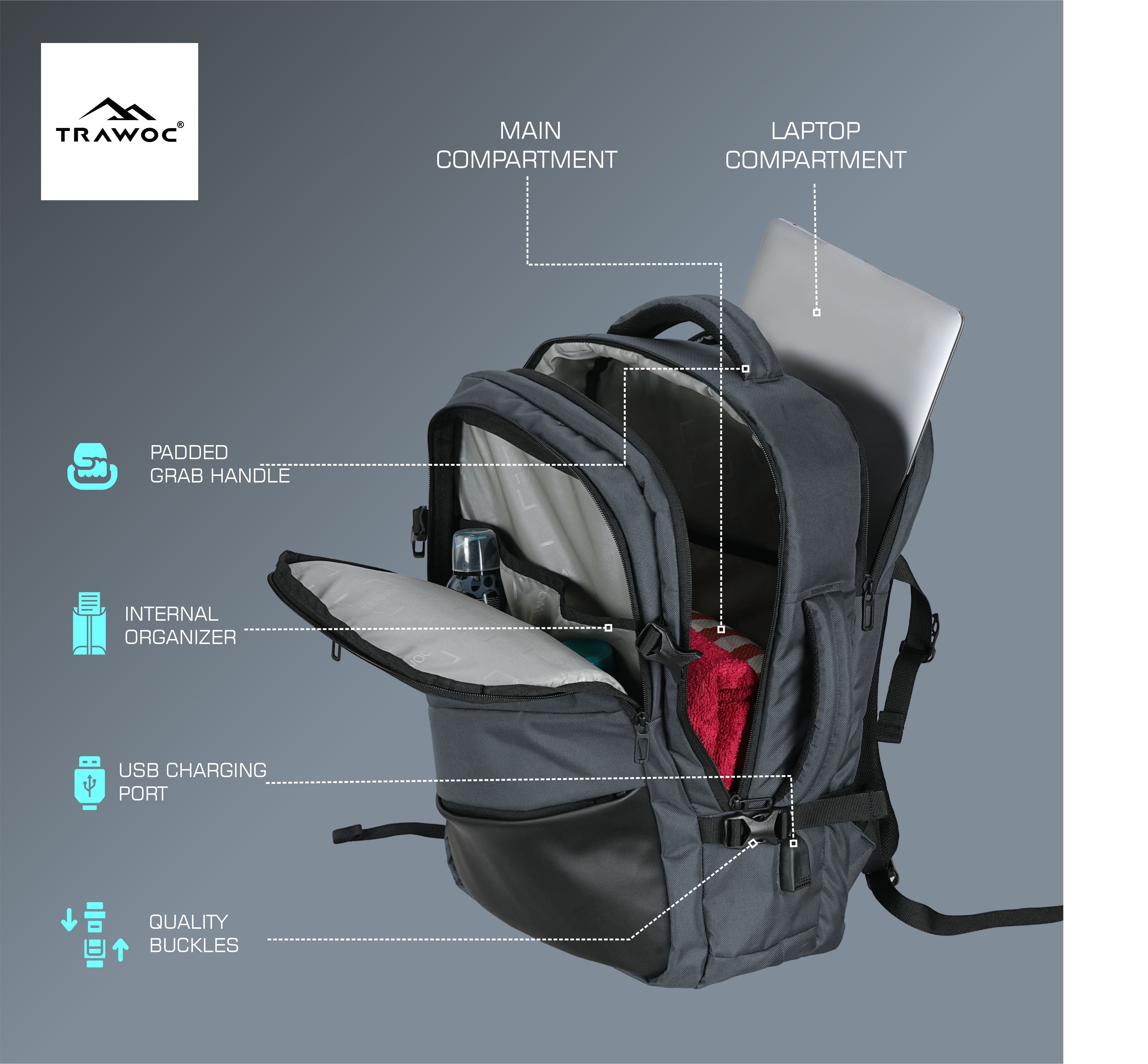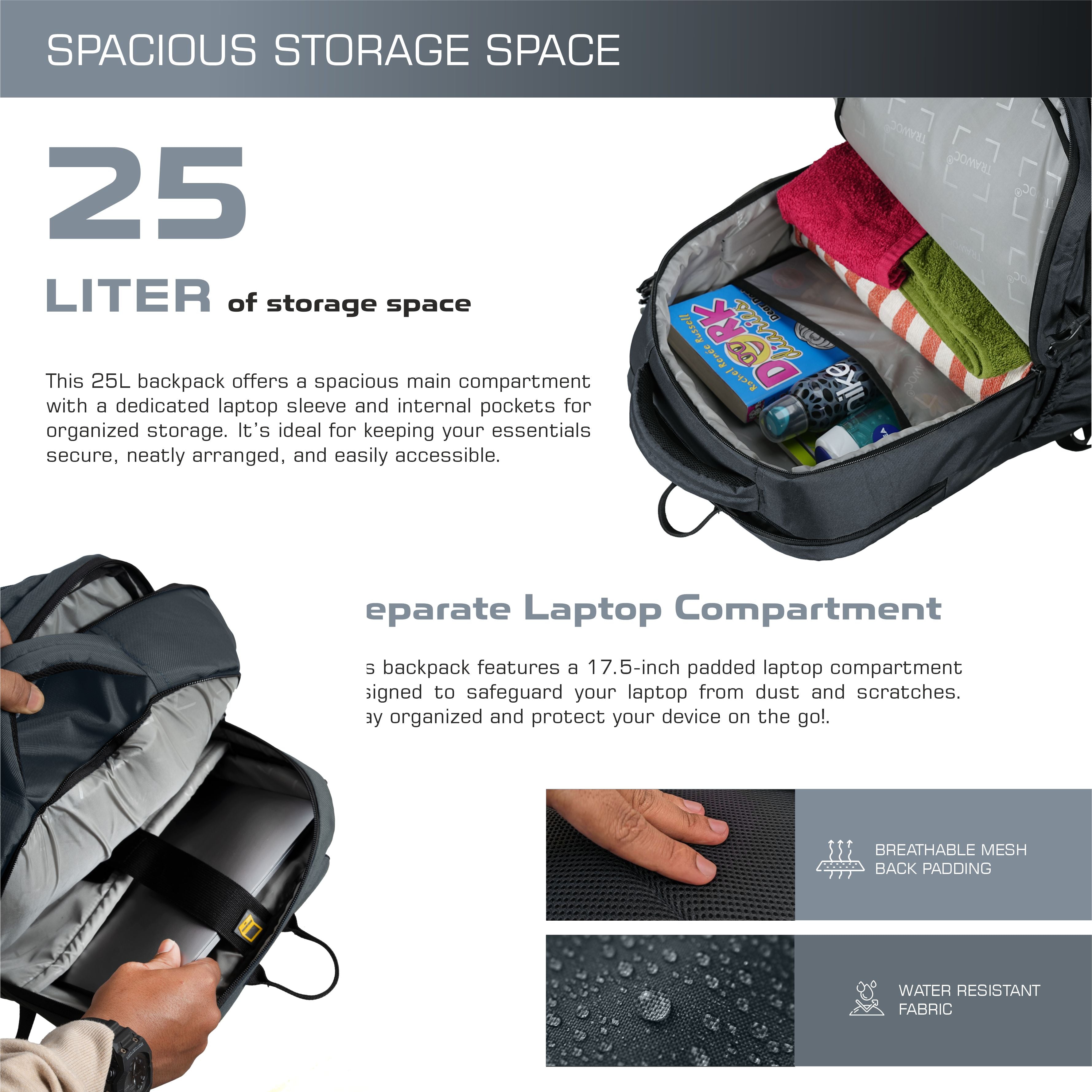 Padded Laptop Compartment: Securely holds laptops up to 16 inches, protecting them from shocks, drops, and scratches while travelling.