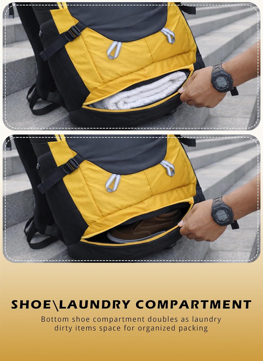 Shoe Compartment: Dedicated bottom shoe compartment keeps footwear and gear organized and separate from main storage.