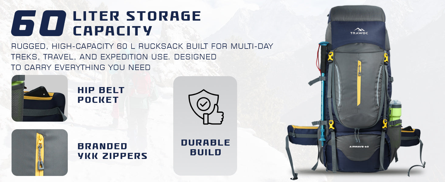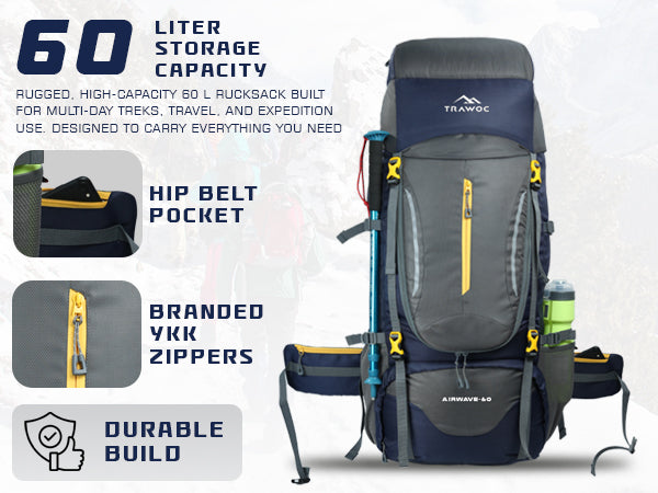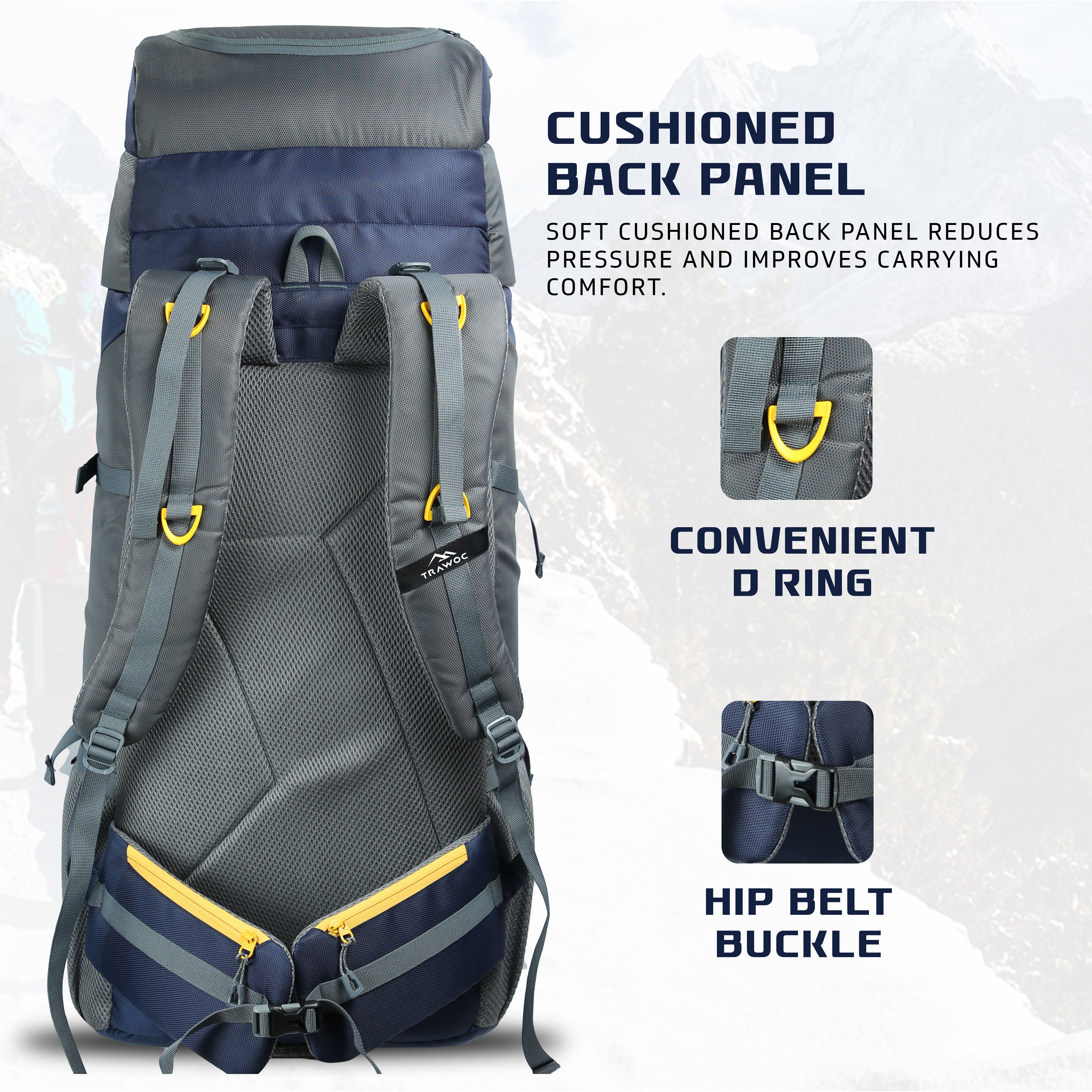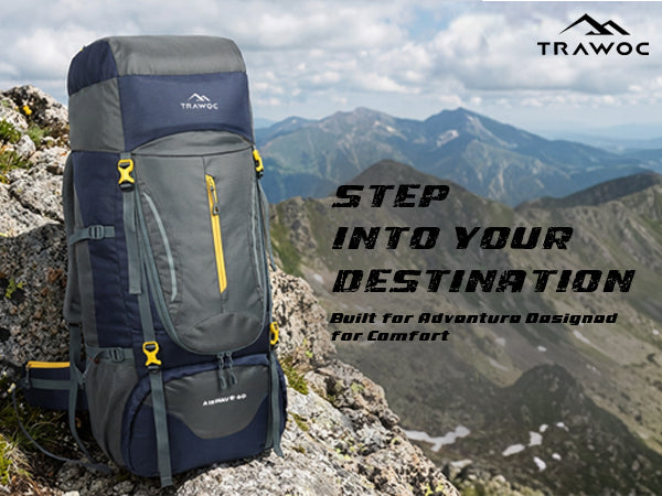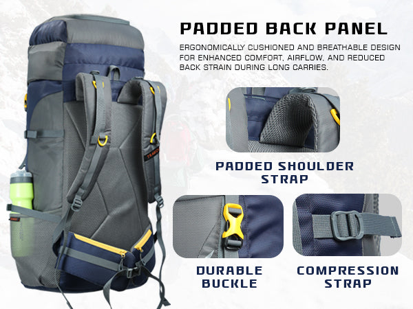 Comfortable Carry: Ventilated air-mesh back panel, padded shoulder straps, and hip belt ensure balanced weight and comfort.