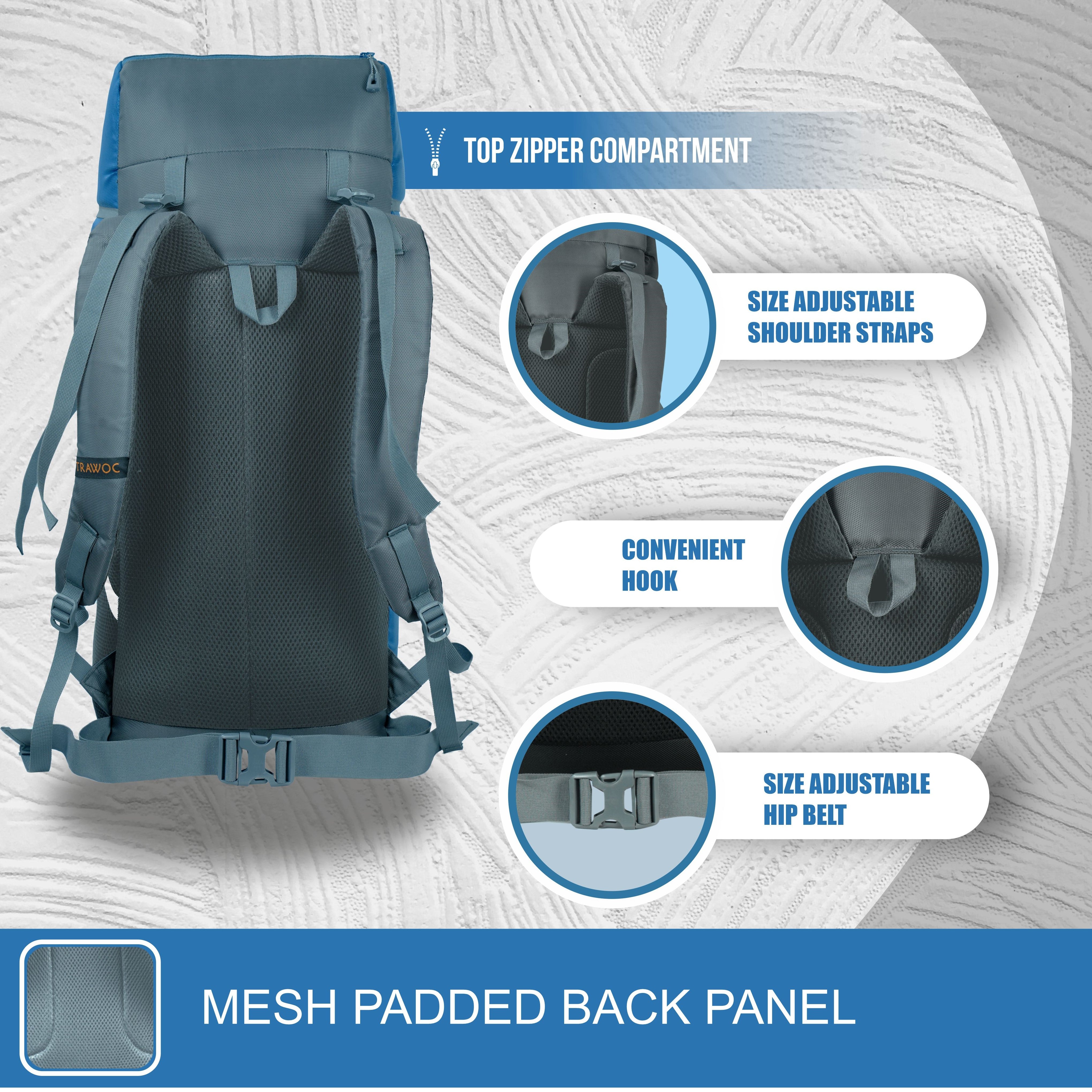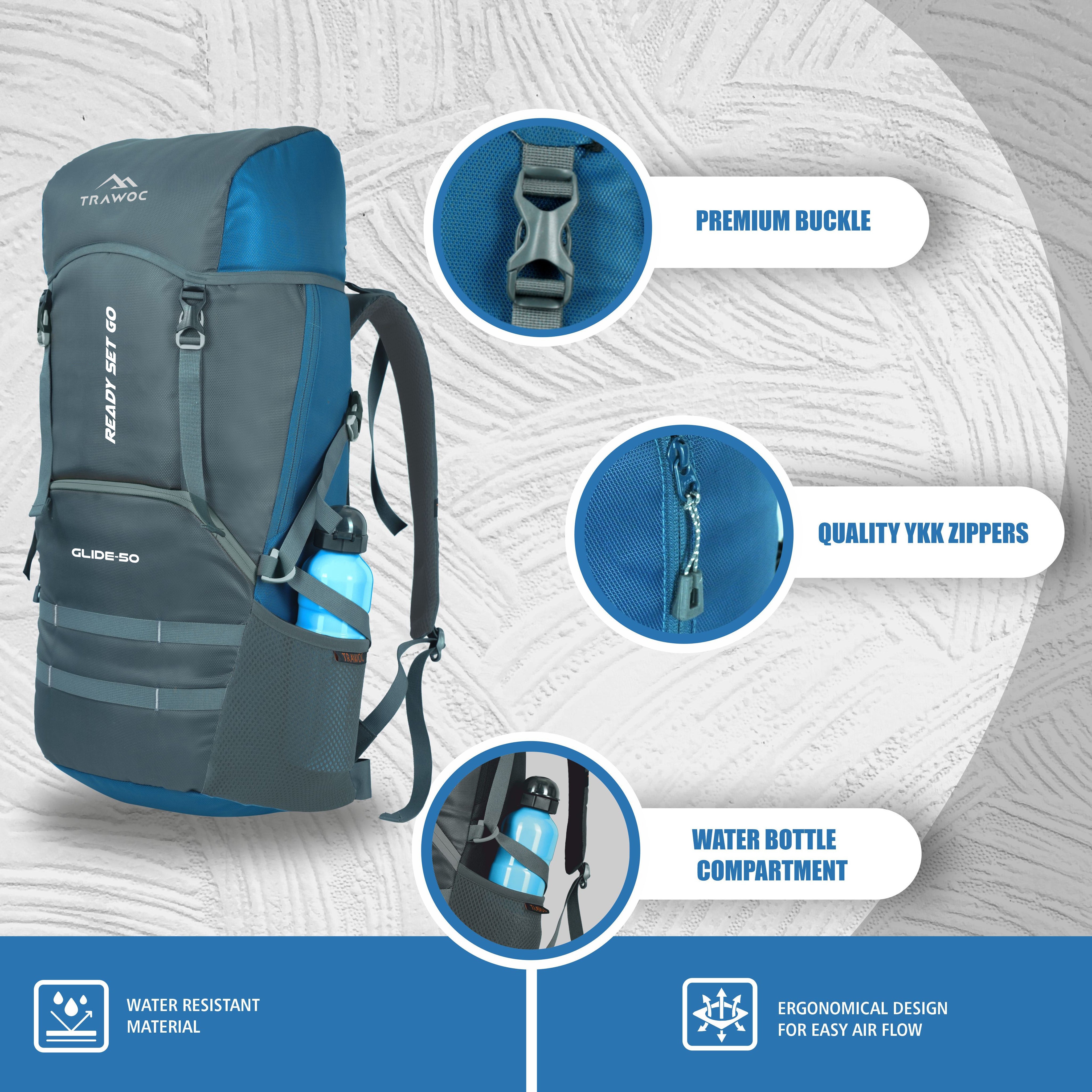 This trekking backpack has straps for attaching the trekking poles, fishing rods or camping accessories for additional load. A large side mesh pocket to hold the water bottle. Additional pockets for keeping small items and compression straps for adjusting the volume. Premium quality YKK zippers for smooth functioning.