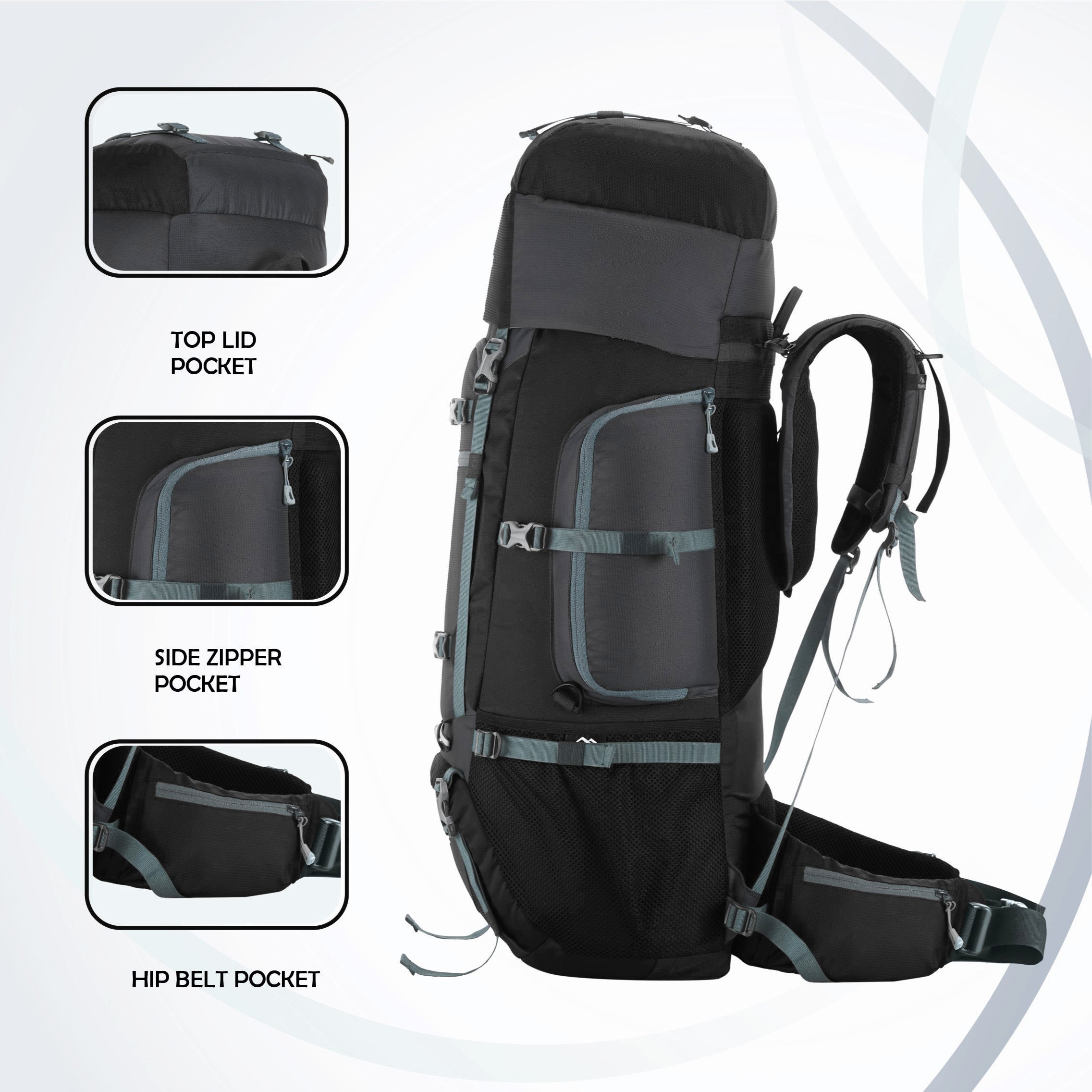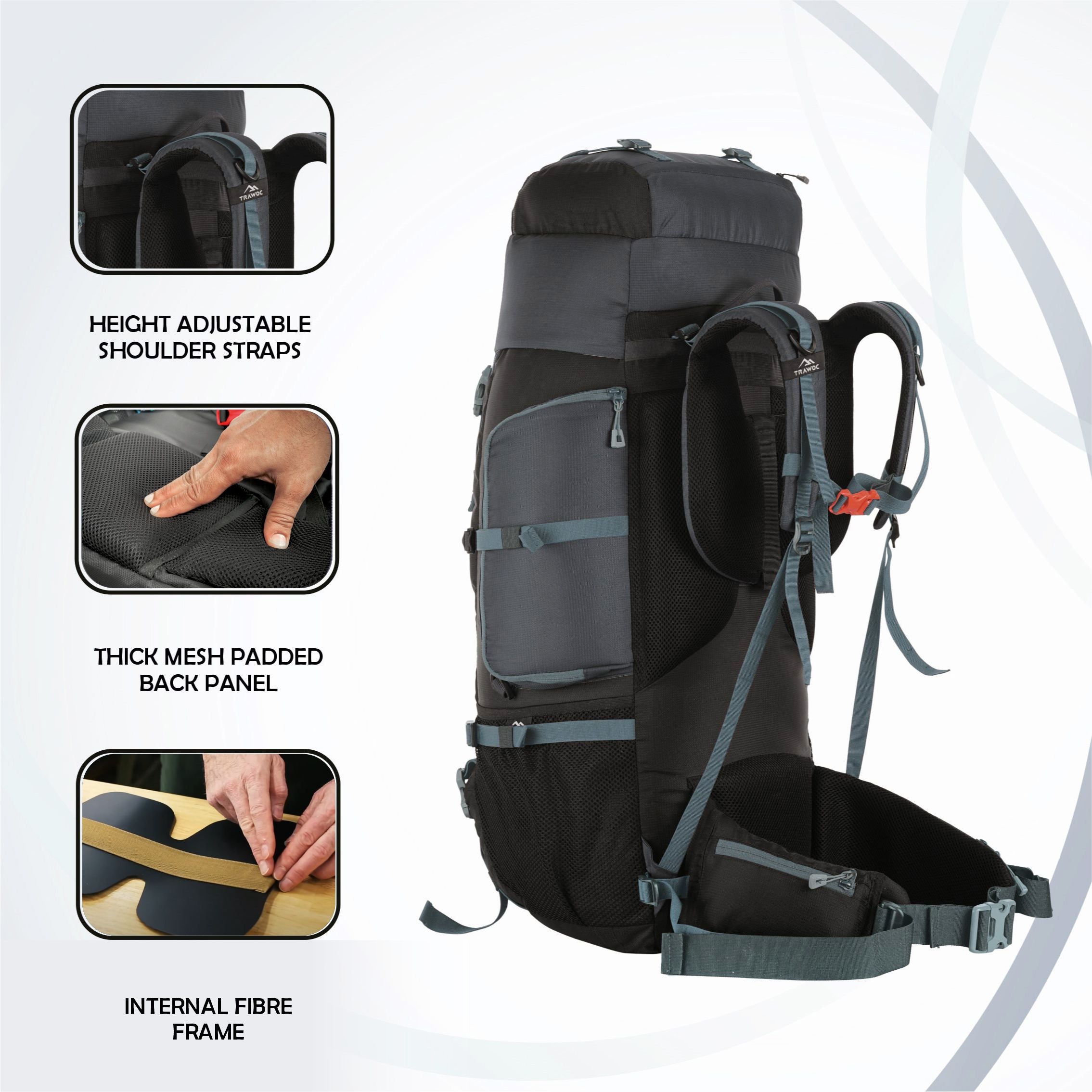 Ergonomic Support System: Internal fiber frame, padded back panel with air ventilation, adjustable torso system, and padded hip belt for comfort and stability on long trips.