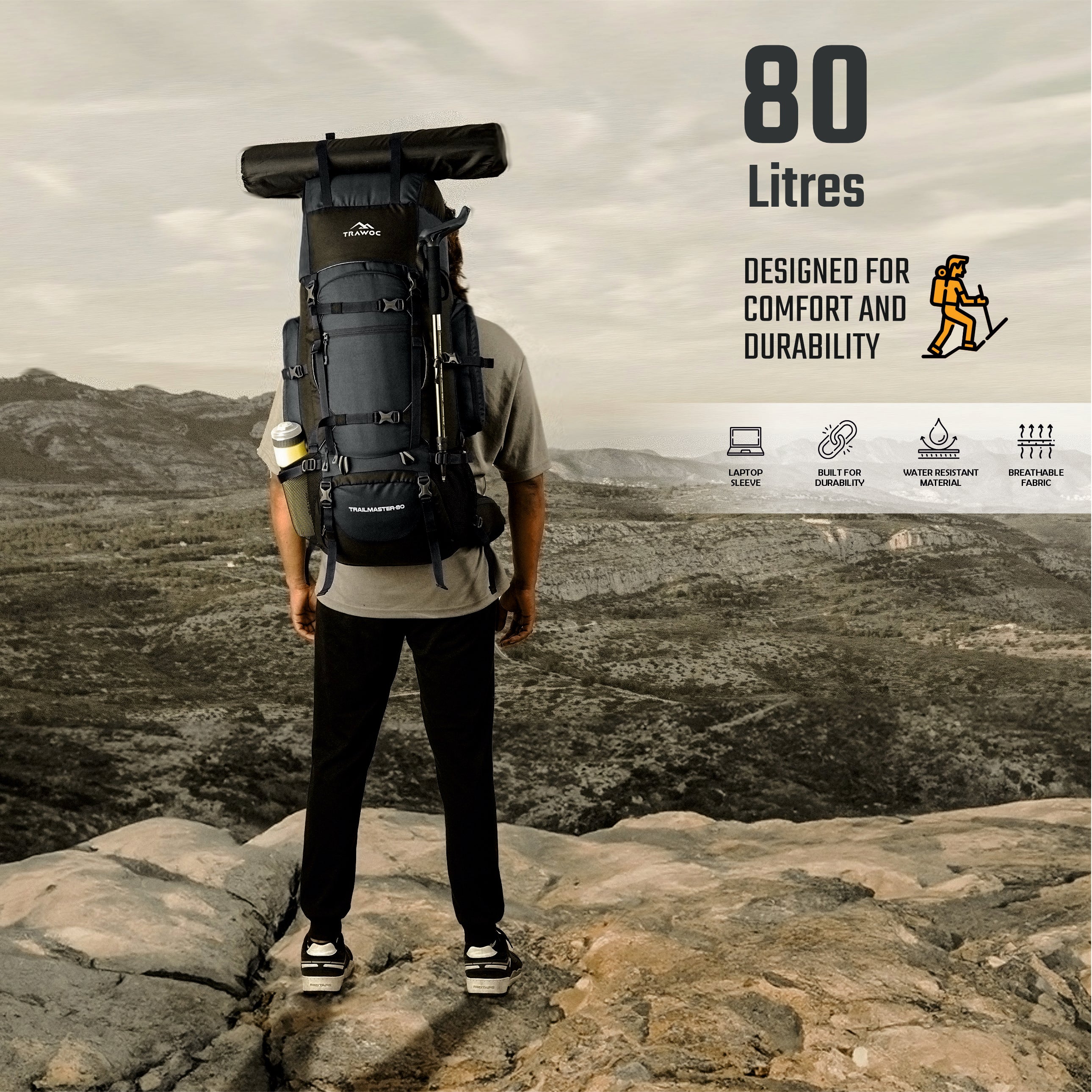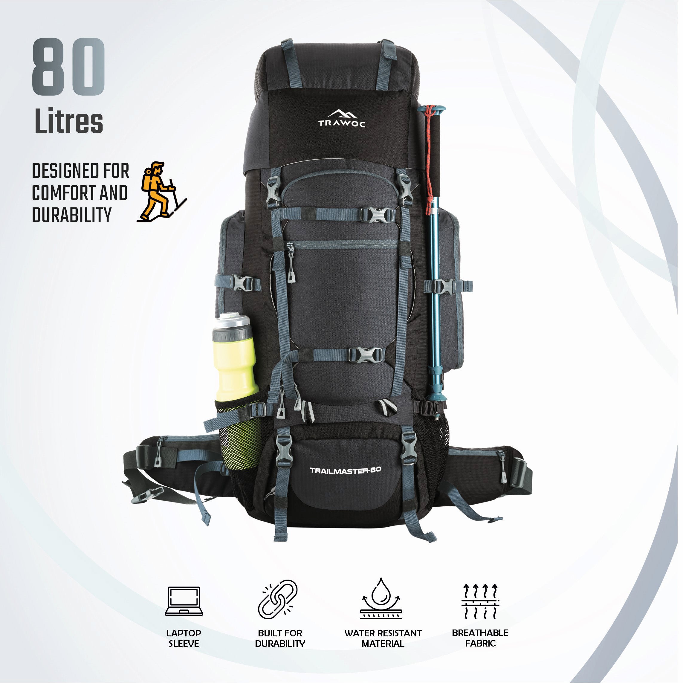Spacious 80L Design: Large-capacity trekking backpack with top and front loading, ideal for camping, hiking, and travel. Includes multiple zip compartments and a dedicated laptop sleeve (up to 16.5").