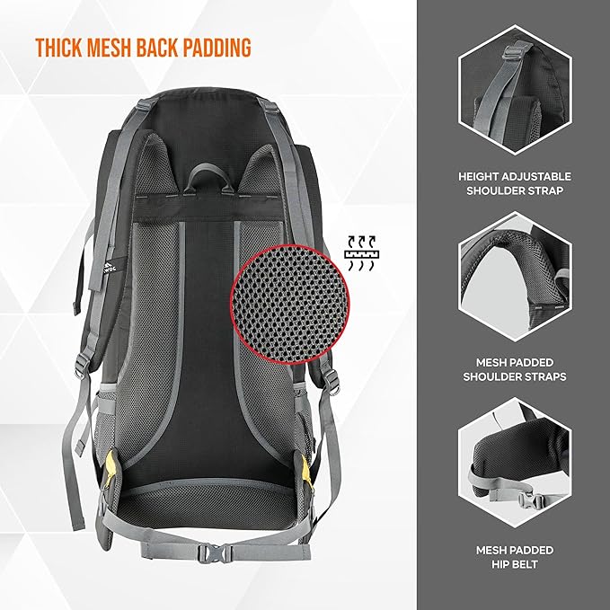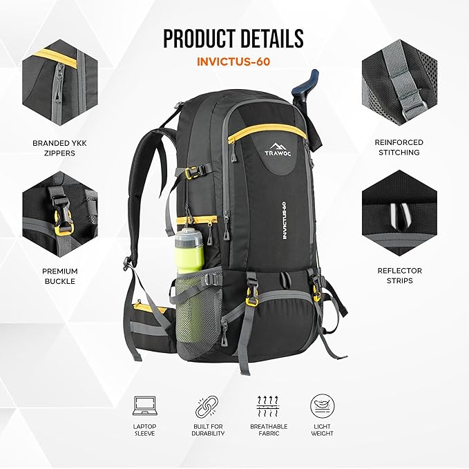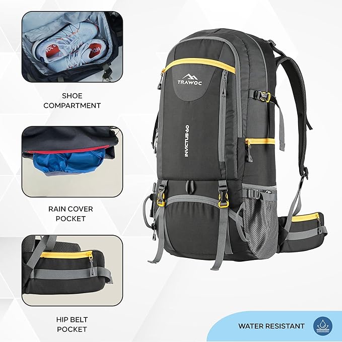 Experience the Trawoc 60L Adjustable Backpack, designed to withstand tough outdoor conditions. Made from water-resistant material, it keeps your gear dry and secure, making it ideal for hiking, trekking, and camping.