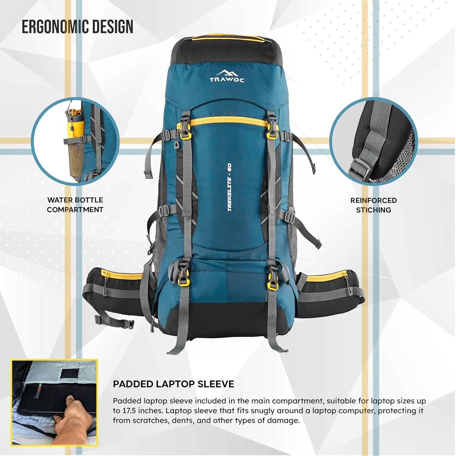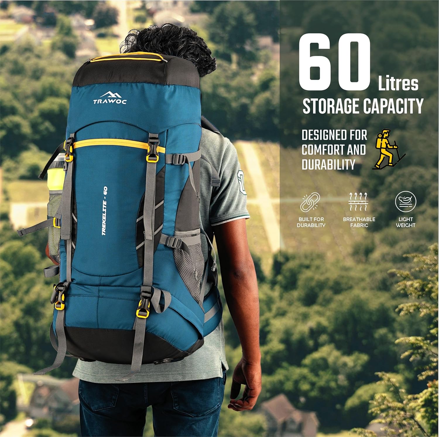 TRAWOC presents 60 liter rucksack bag for hiking, trekking and travelling. This bag pack has water-proof resistant material, padded mesh back panel, ergonomic design and various compartments. This backpack will surely contribute to your fantastic travel experience.