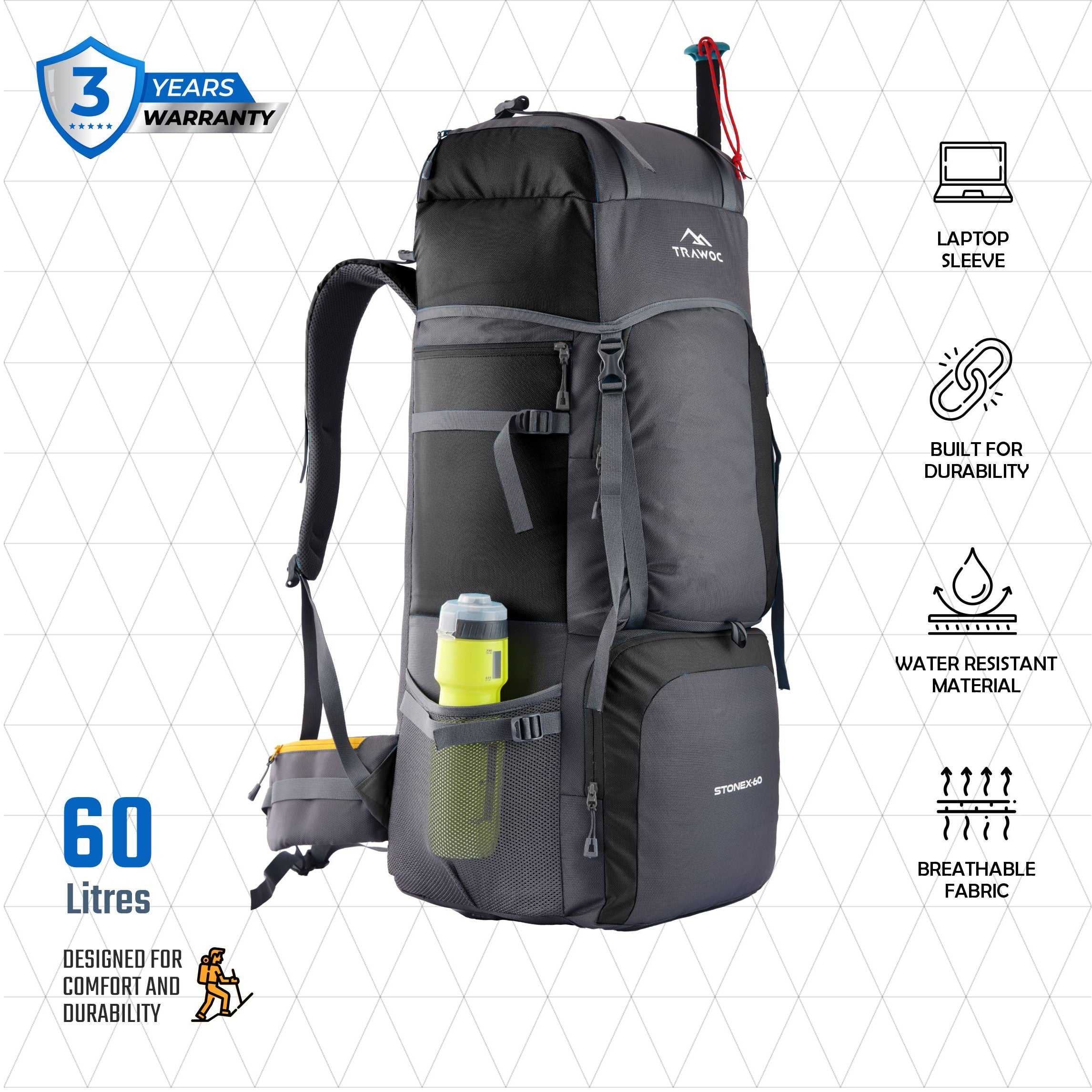 Spacious Design: 60-liter capacity backpack suitable for trekking, hiking, camping, and travel.