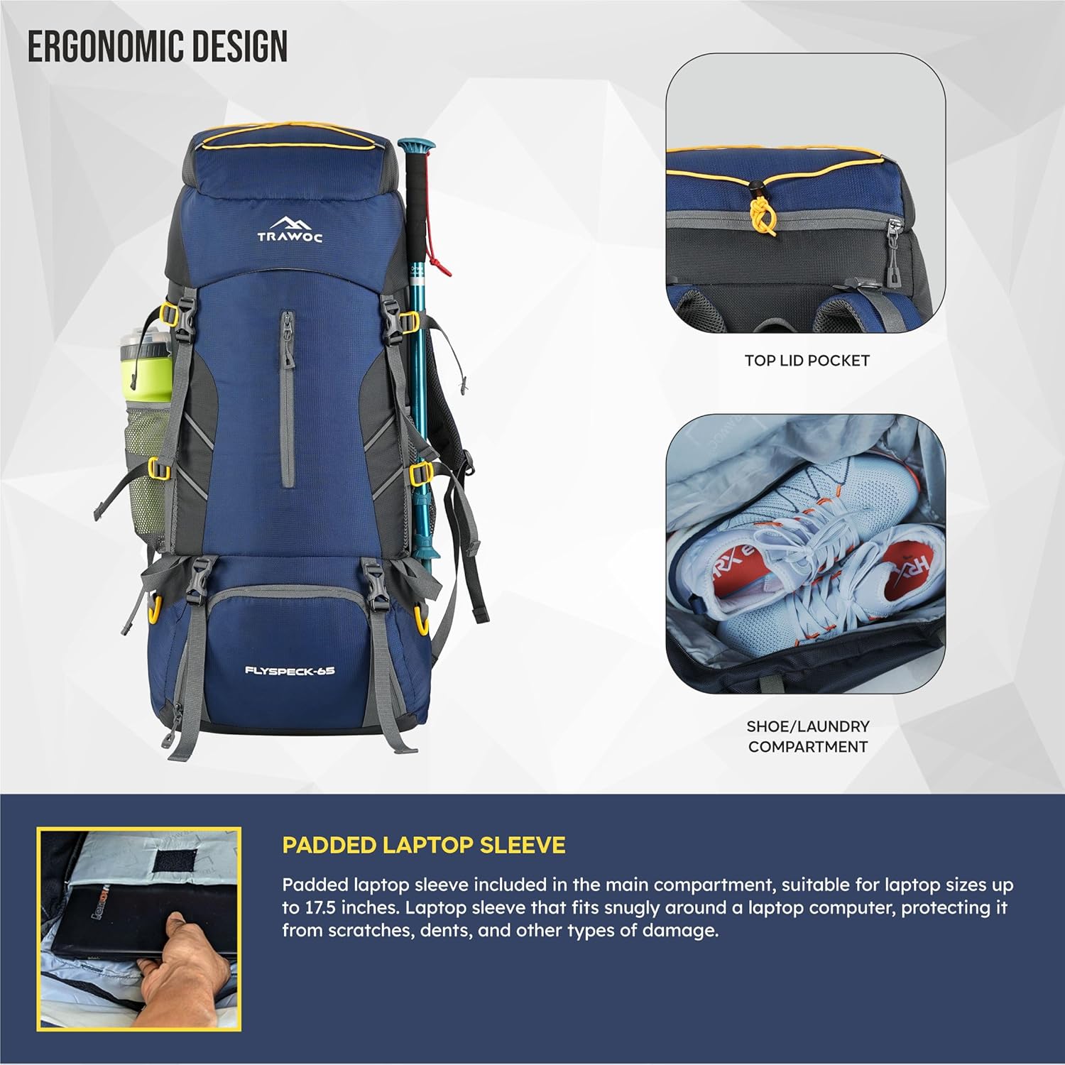 The hiking backpack is 65 litres, which means it is triple times the normal requirement of a backpack.