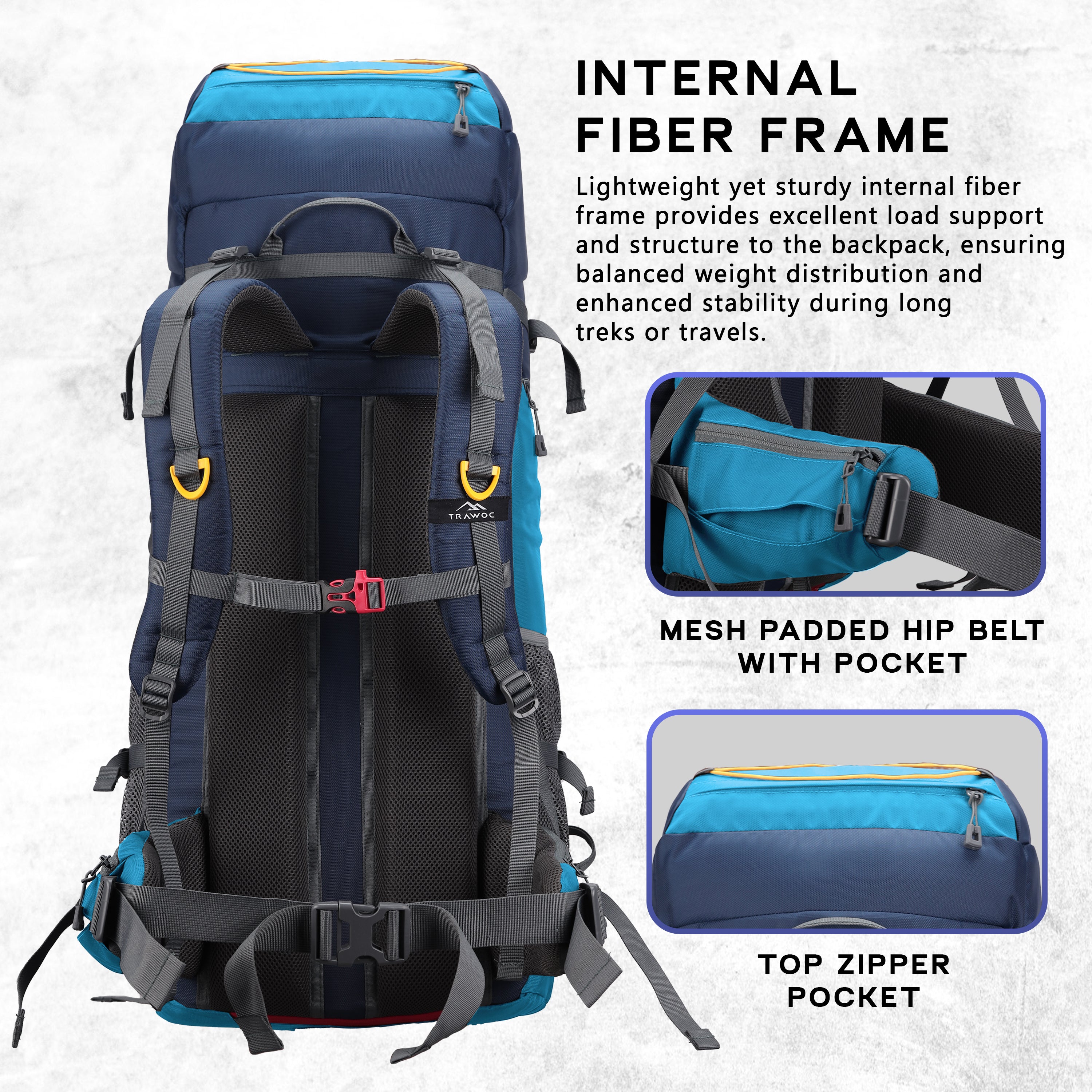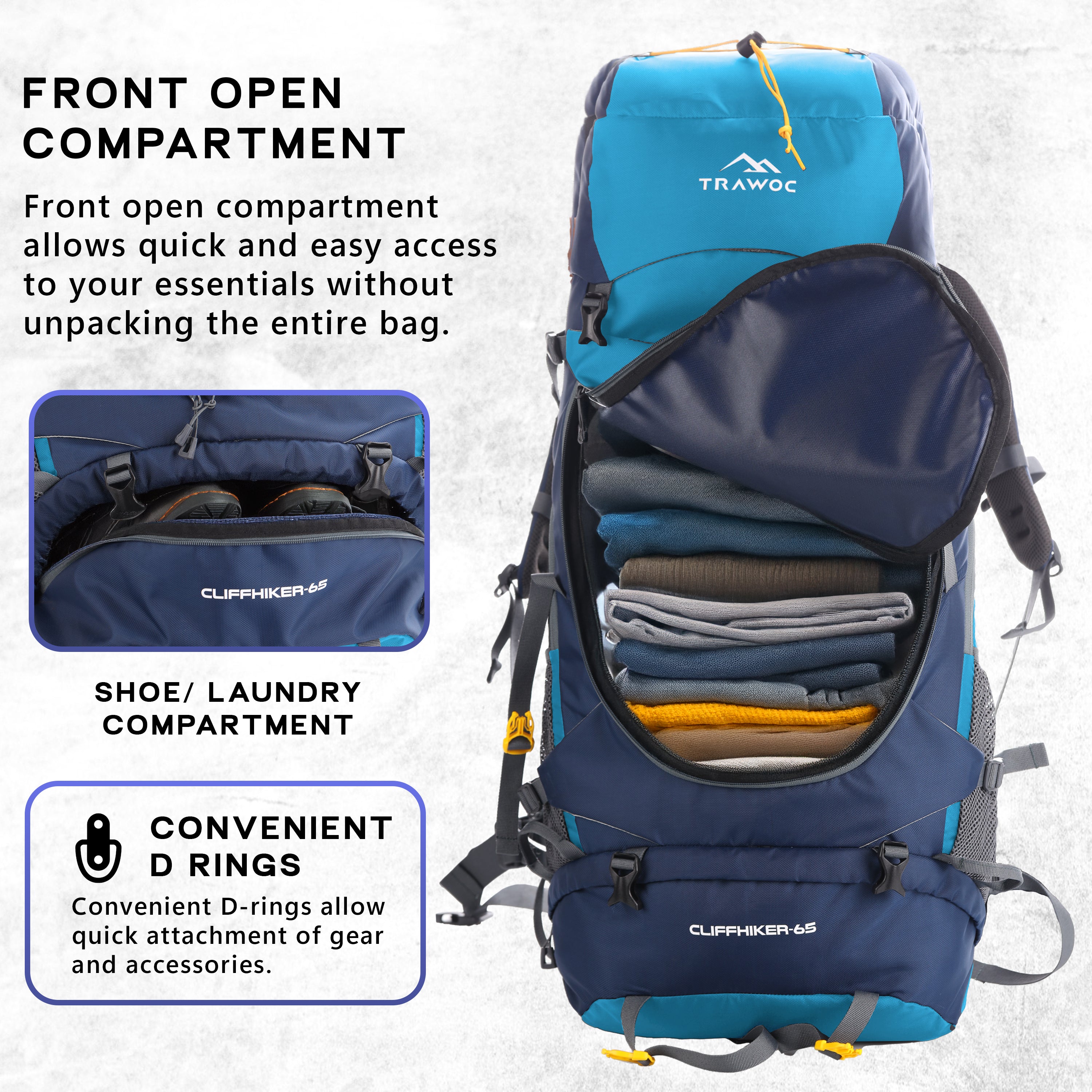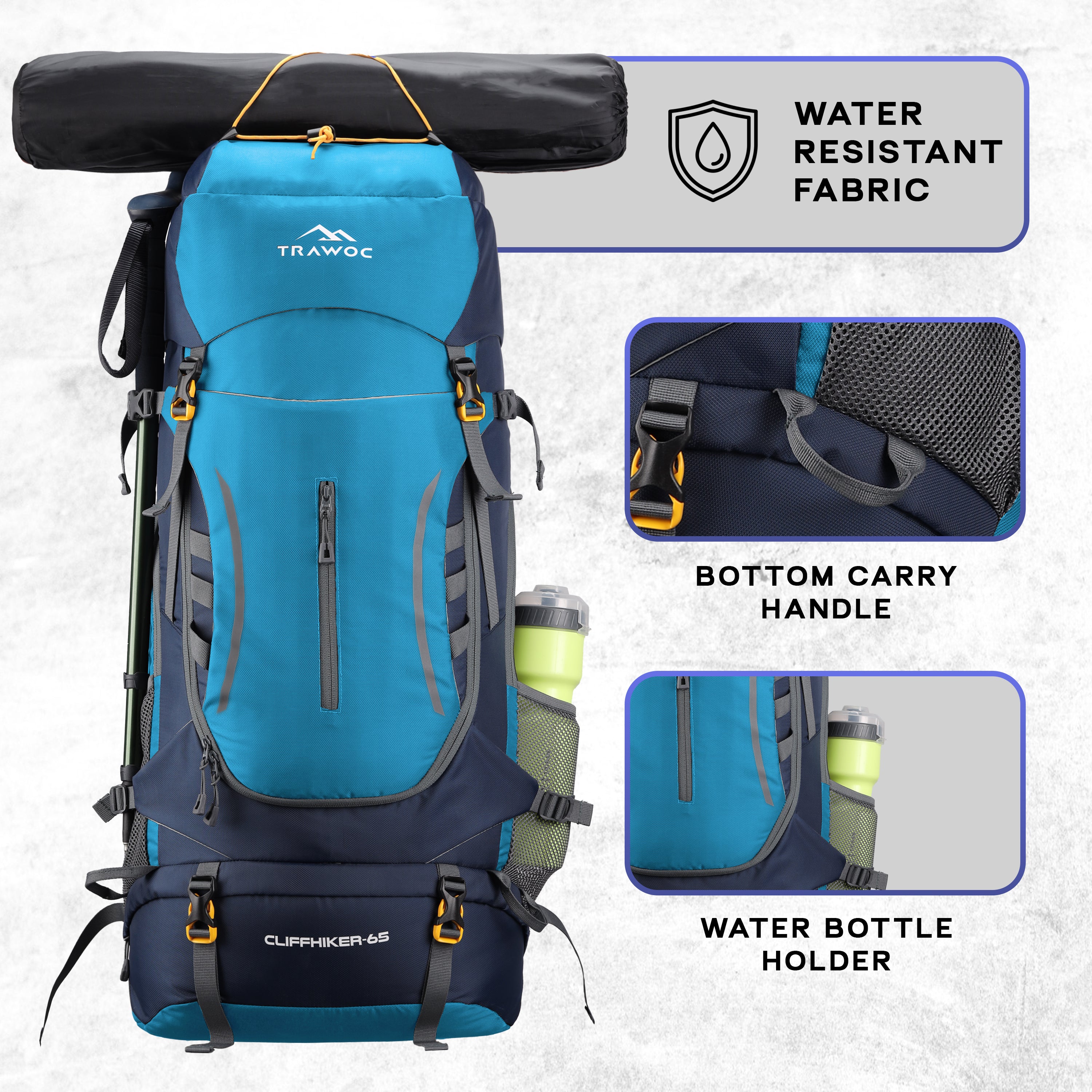 Cliffhiker 65 L Rucksack featuring Durable Zippers & Laptop Compartment – Skyblue - TRAWOC