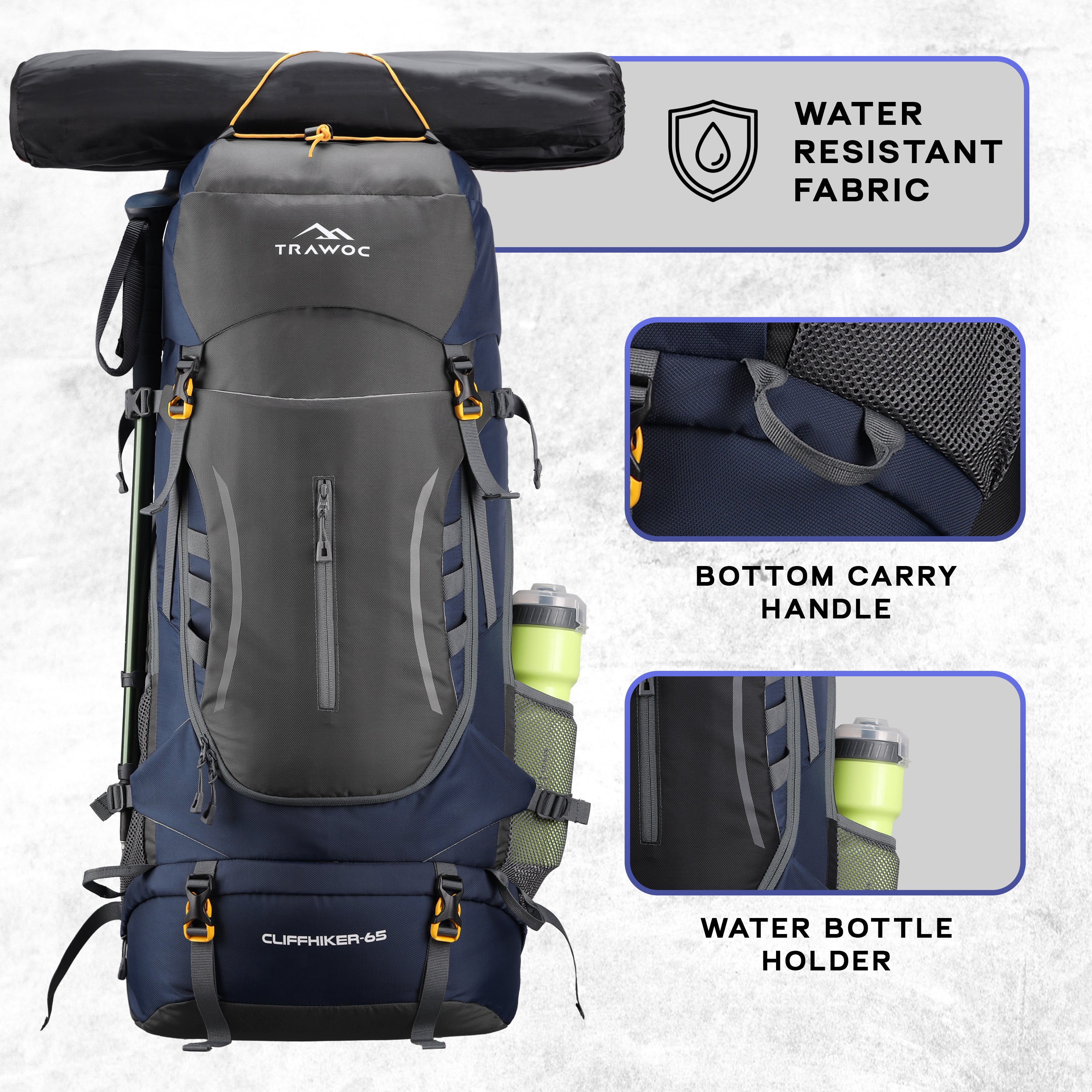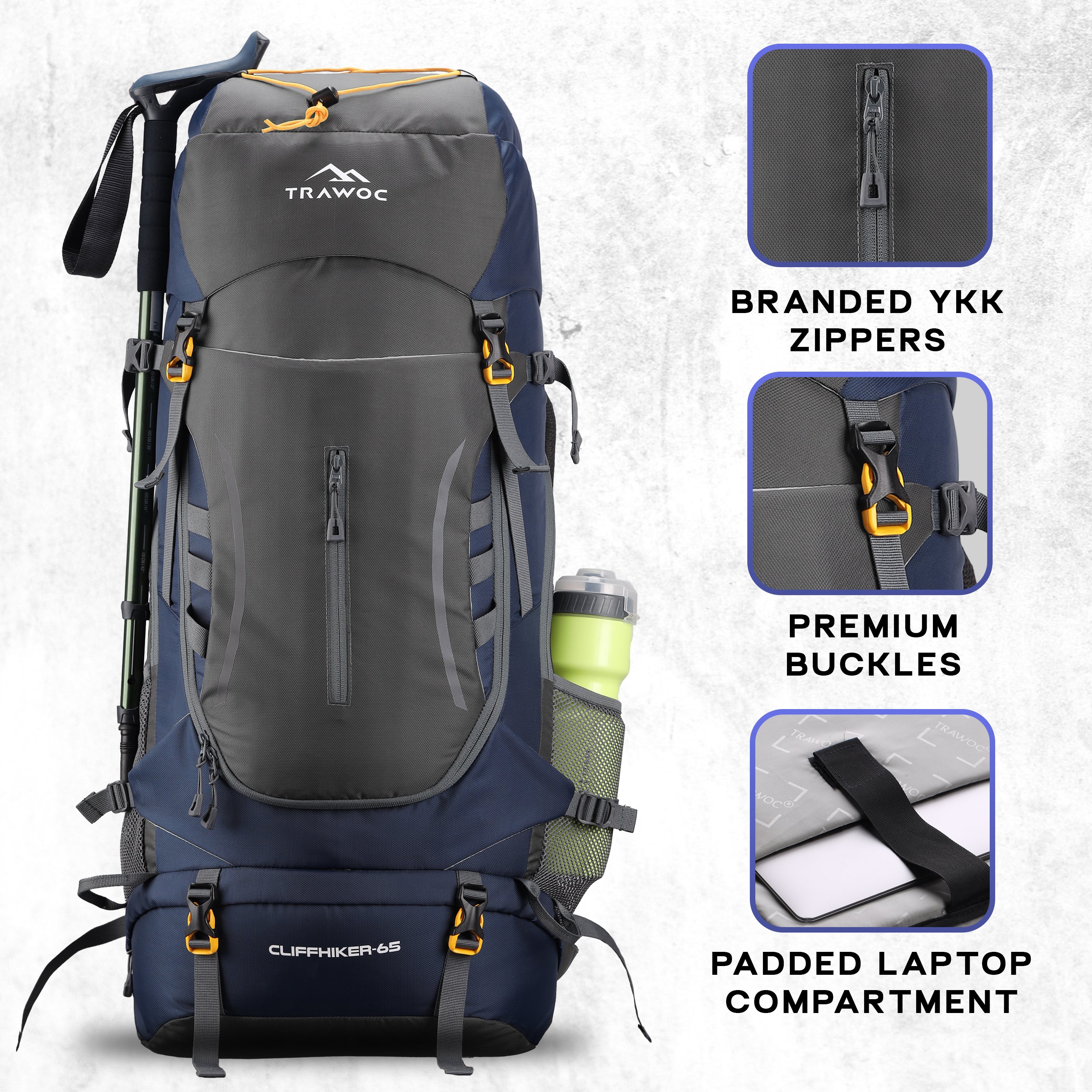 Cliffhiker 65 L Rucksack featuring Durable Zippers & Laptop Compartment – Grey - TRAWOC