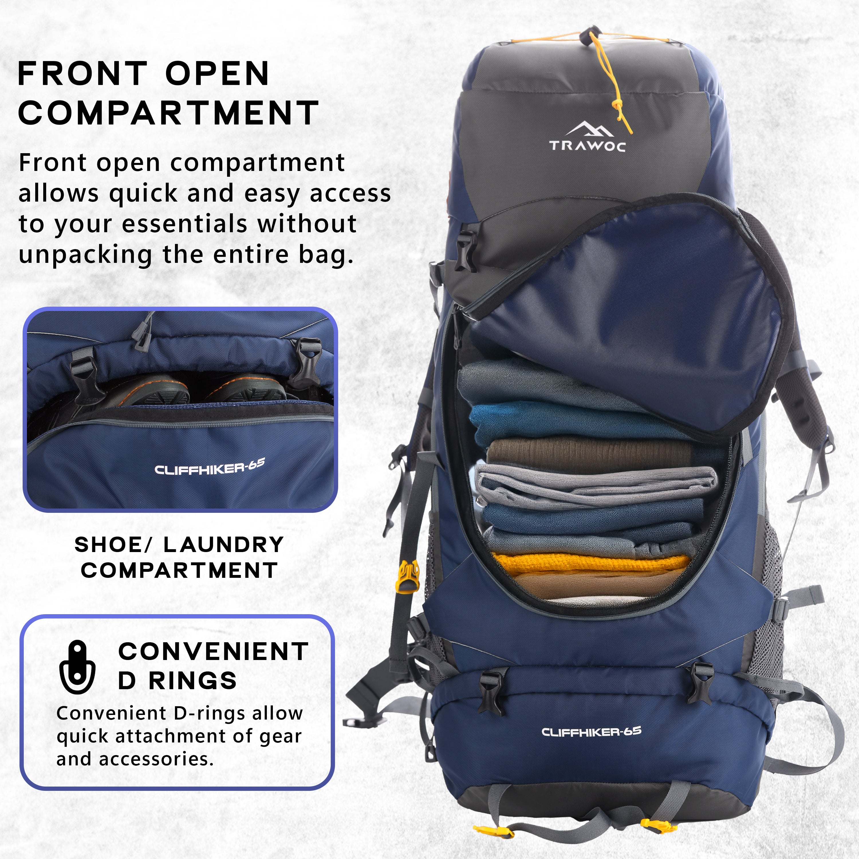 Spacious 65L Capacity: Designed for trekking and travel, this bag comes with front and top opening, a padded laptop sleeve (up to 17.5"), and a separate shoe compartment for better storage.