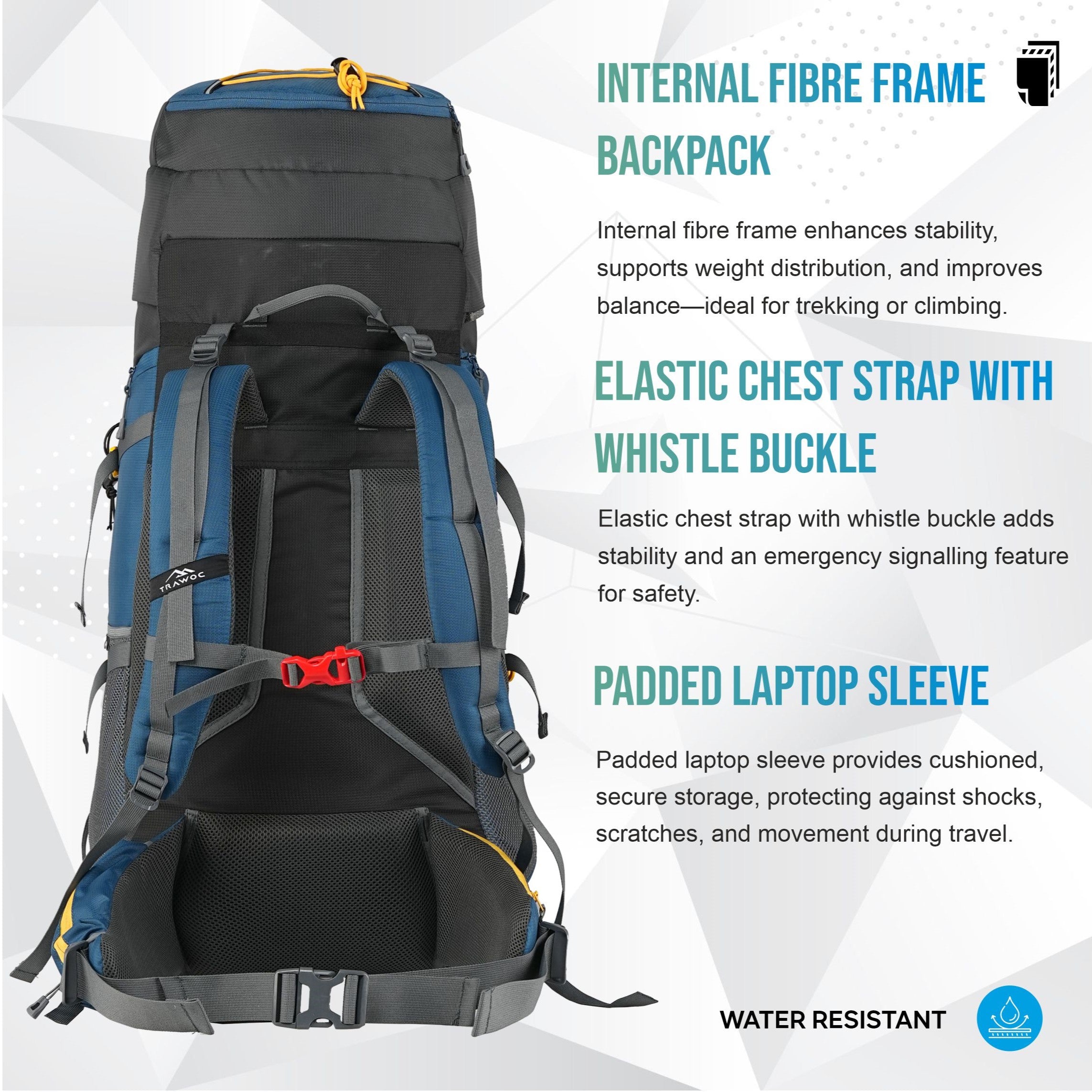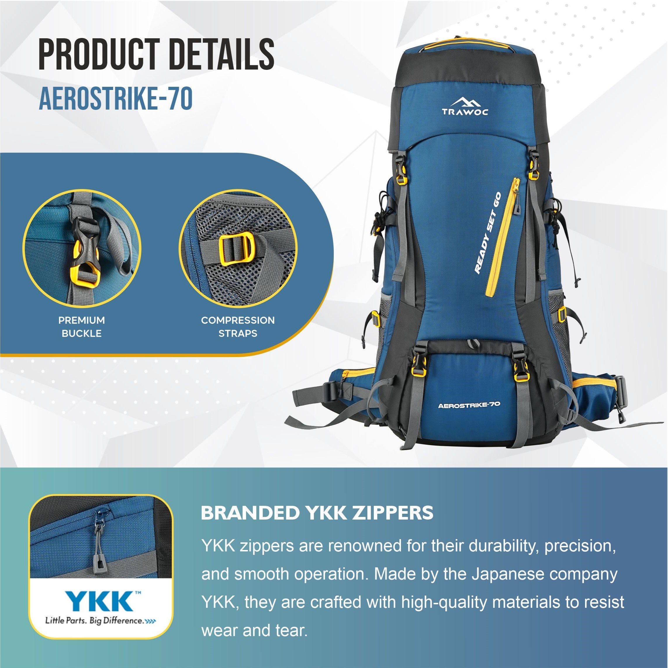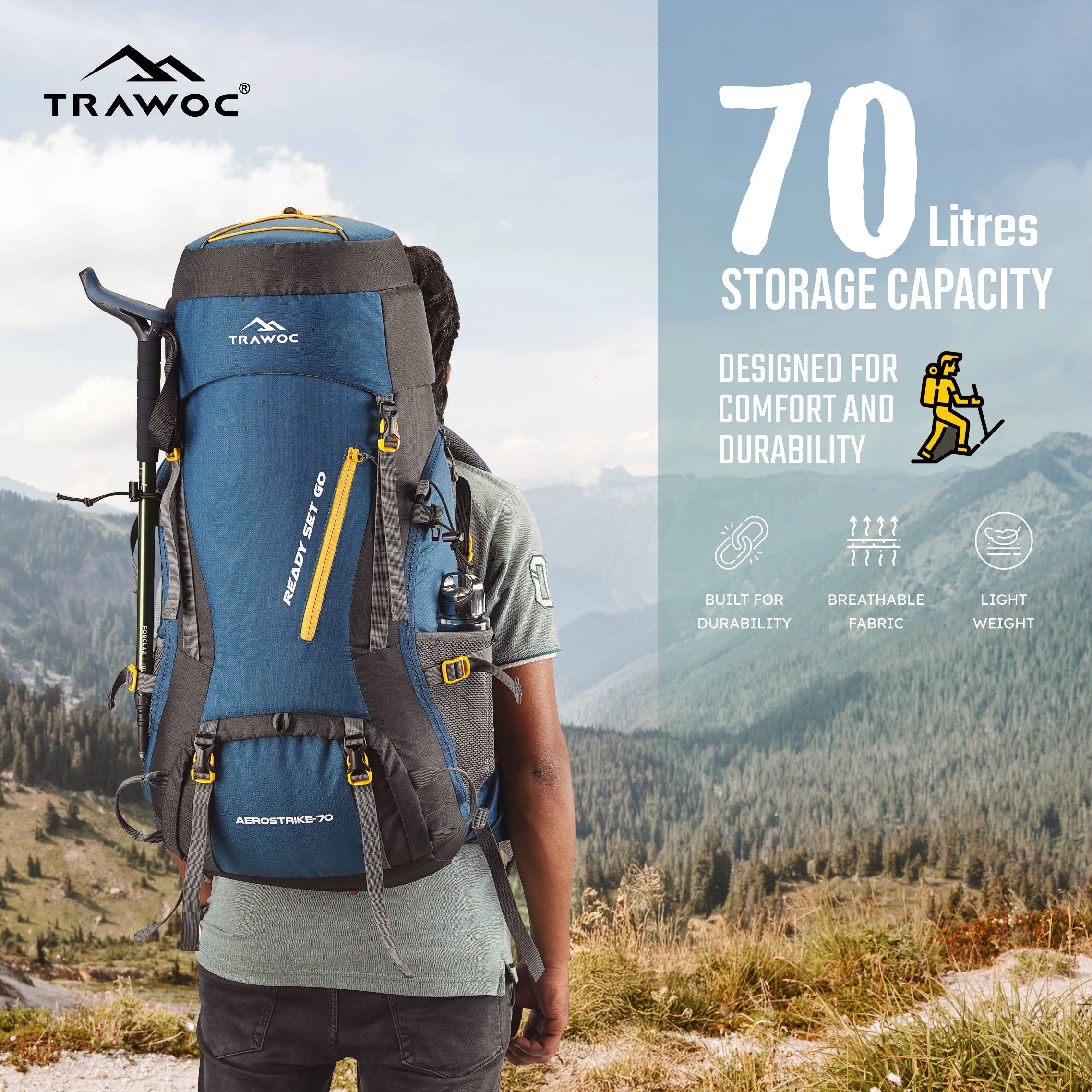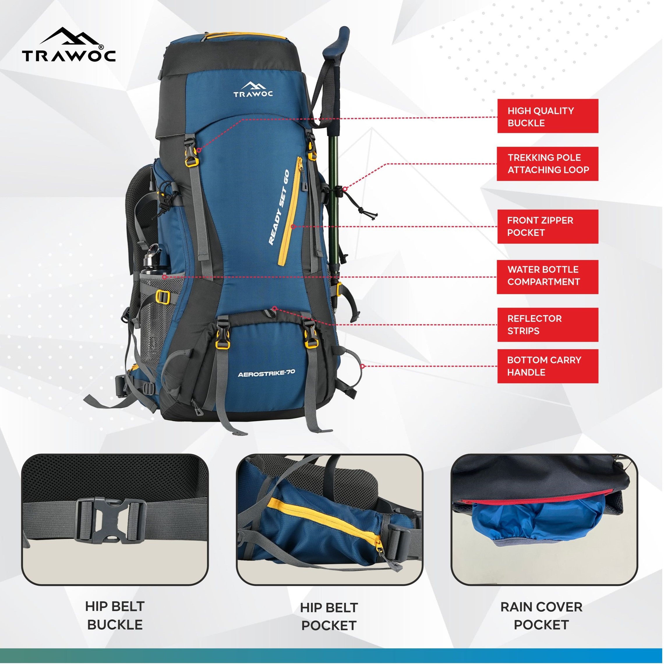 Aerostrike 70L Trekking Bag with Laptop Compartment & Rain Cover, ideal for Hiking - Englishblue - TRAWOC
