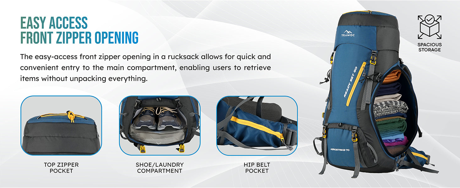 Spacious 70L Design: Large-capacity trekking backpack with front and top loading options, multiple compartments, and a padded laptop sleeve for up to 16.5" laptops.