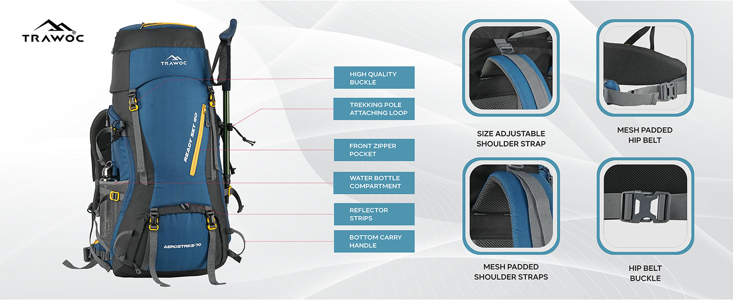 Comfortable & Supportive: Ventilated air mesh back panel, padded shoulder straps, and hip belt with zipper pocket ensure balanced weight and comfort during long treks.