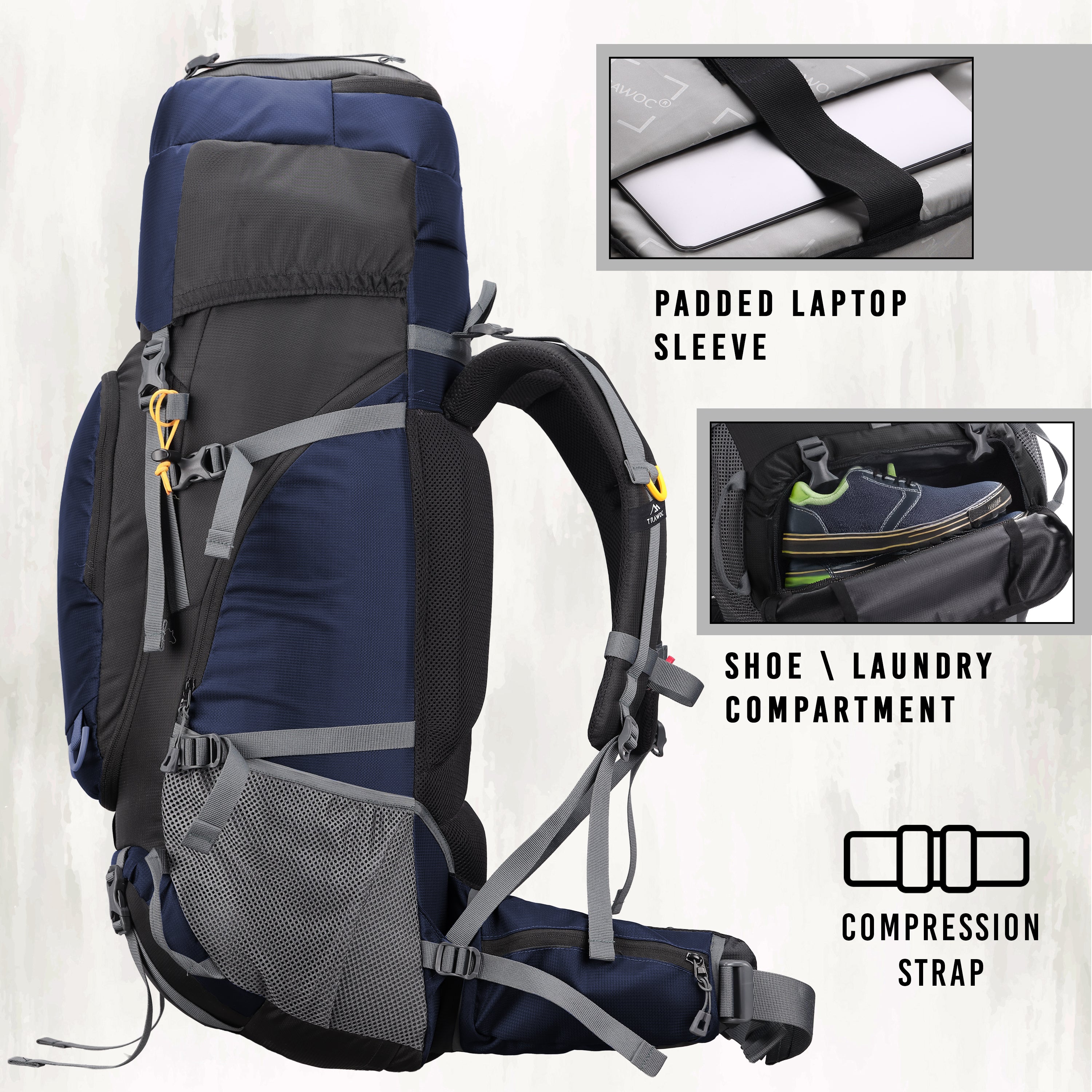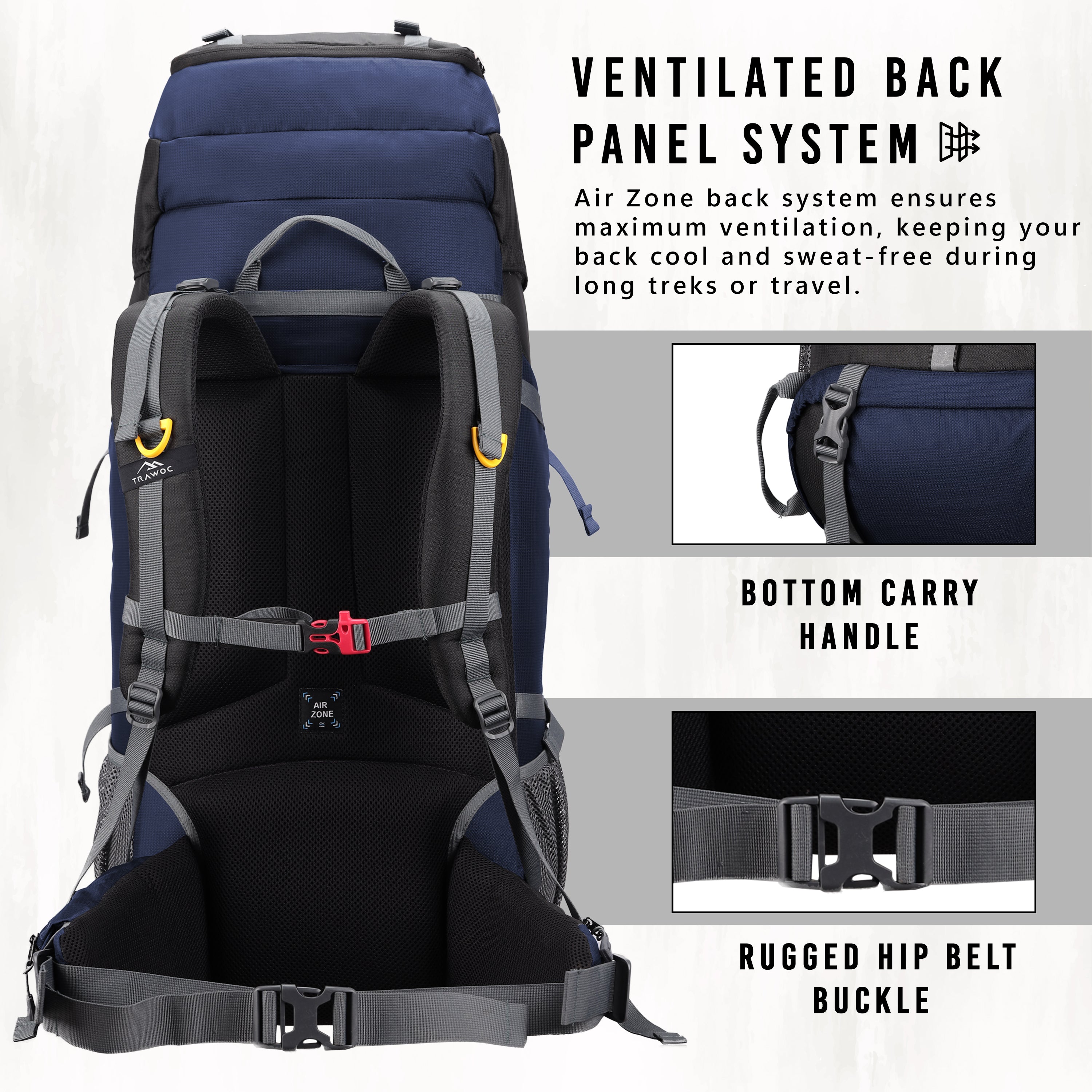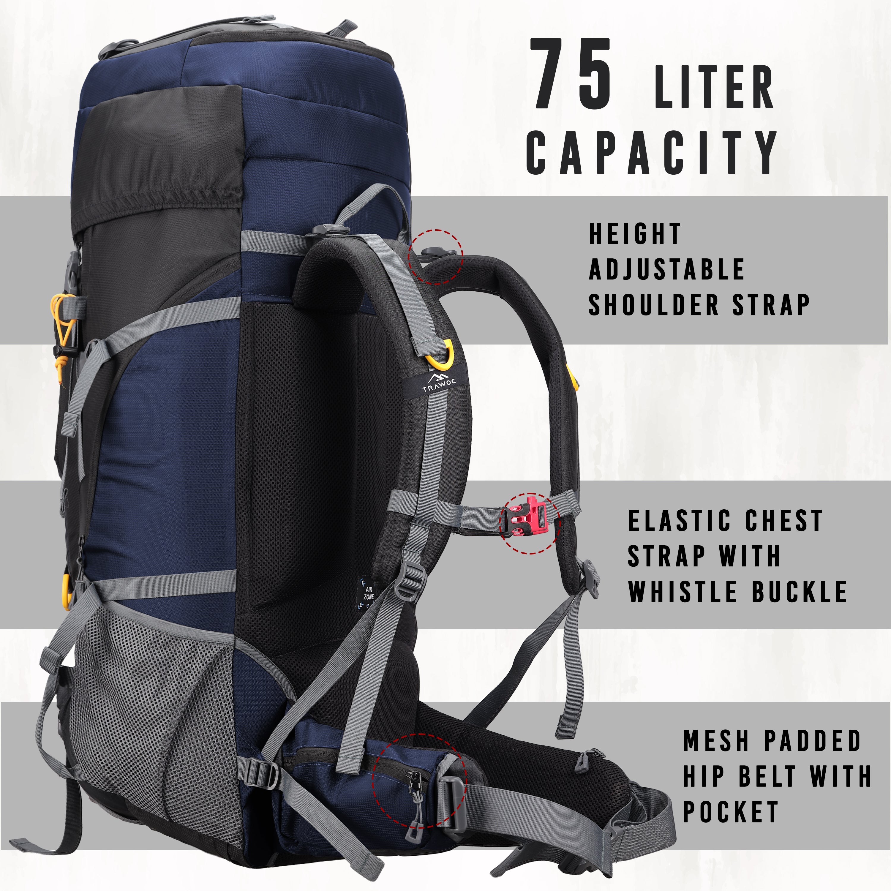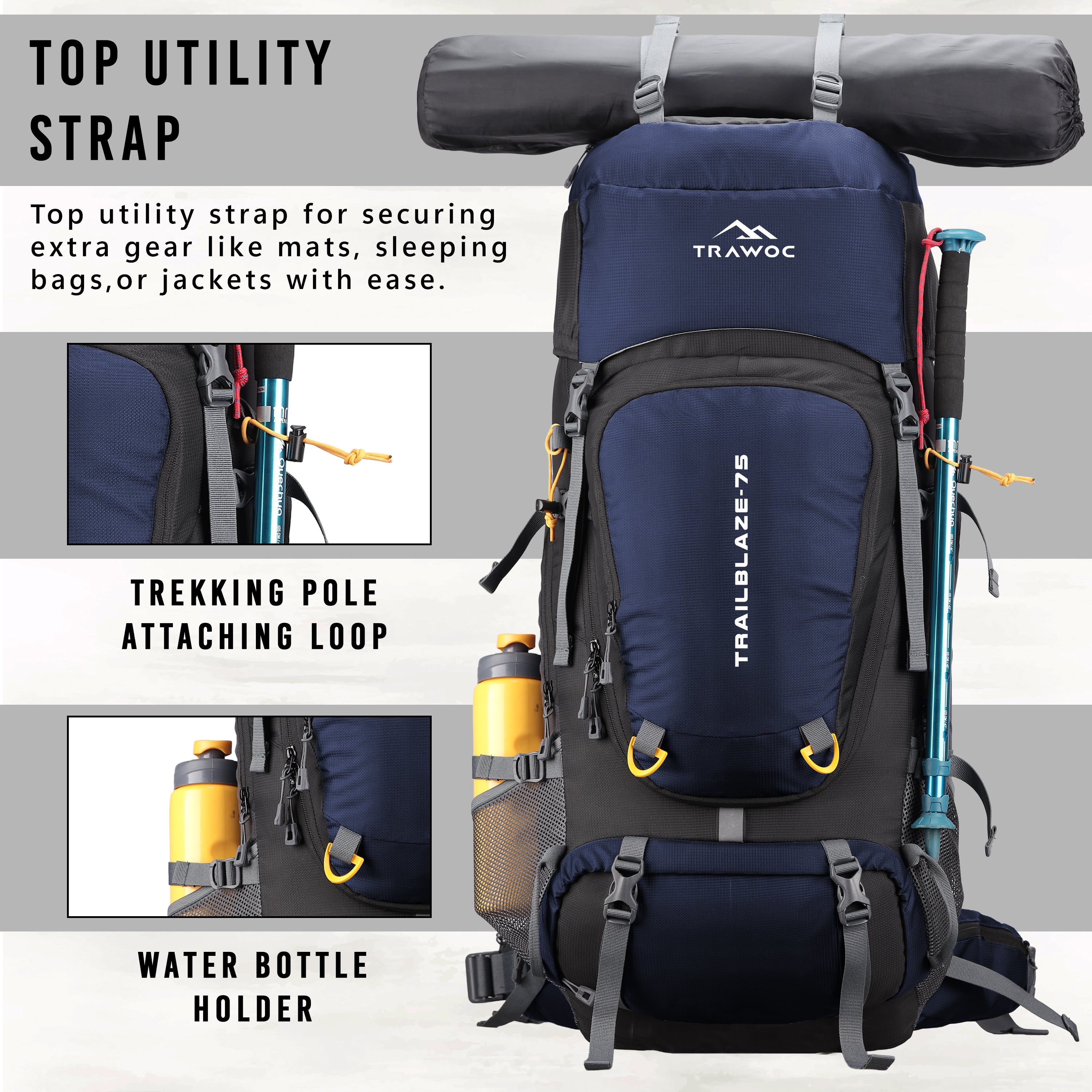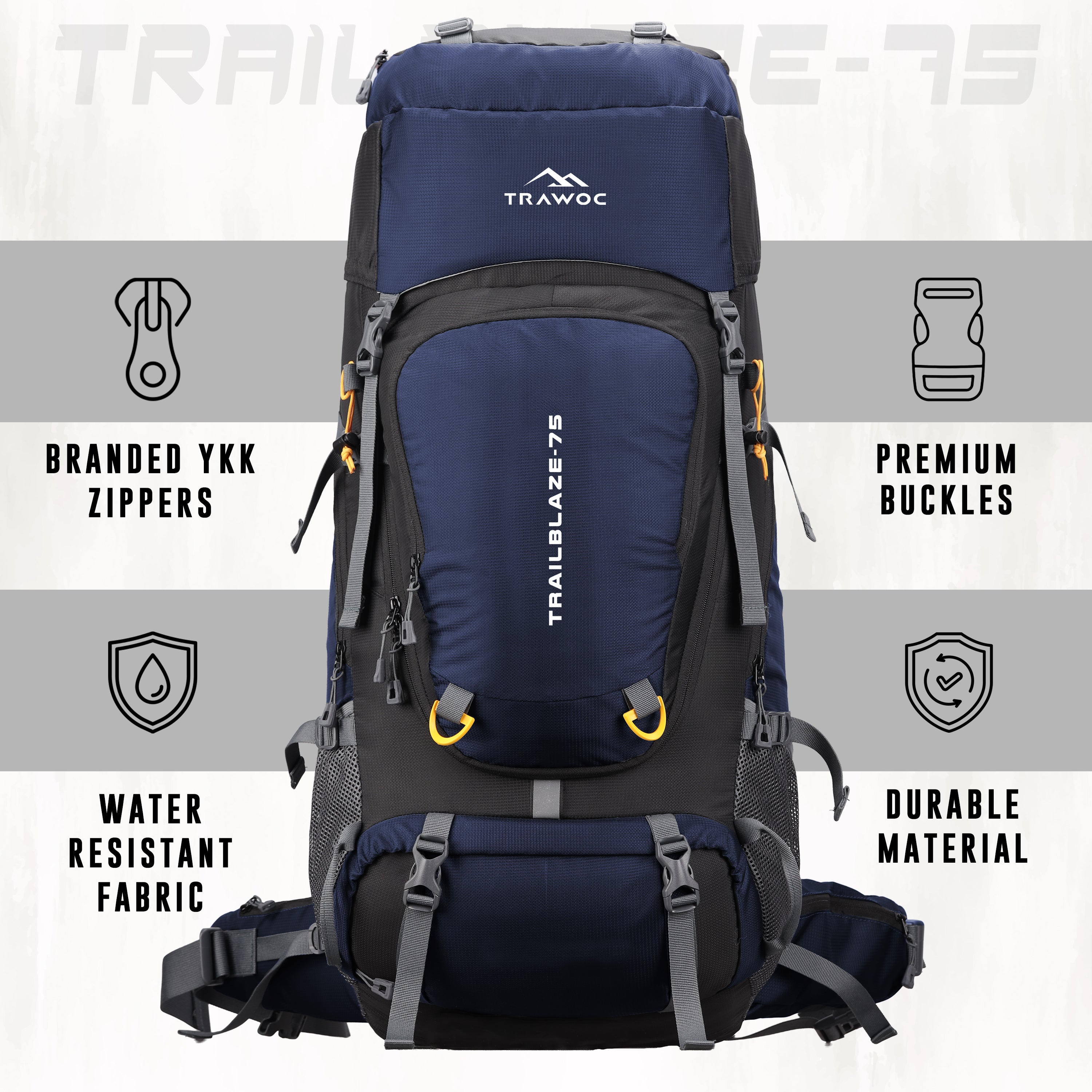 Trailblaze 75 L Trekking Bag with Rain Cover & Durable Zippers - NavyBlue - TRAWOC
