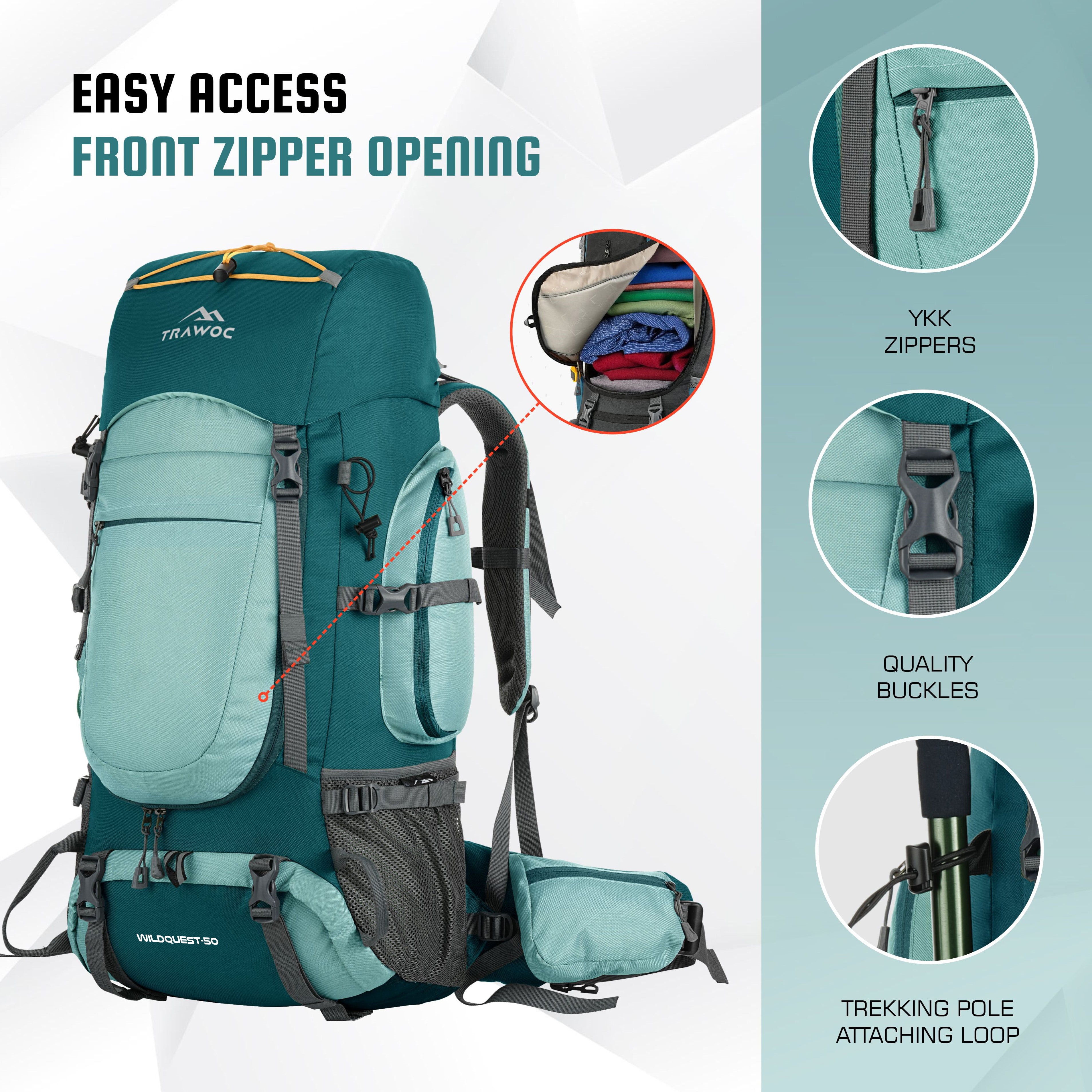 WILDQUEST 50L Travel Backpack with Laptop Compartment, Rain Cover, Shoe Compartment - Shamrock(clearance sale) - TRAWOC